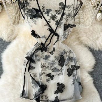 Fleepmart Women’s Sexy Slim Hollow Out Butterfly Embroidery Lace Split Dress Suit Mesh Sheer Traditional Embroidered Stripe Cheongsam Set