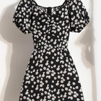 Fleepmart Women Mini Dresses Summer Fashion Female Vestidos Print Floral Chiffon Dresses Shirring Pleated Short Puffy Sleeve Casual Dress