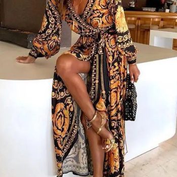 Fleepmart New Style Fashion Elegant Women Sexy Boat Neck Glitter Deep V Neck Print Party Dress Formal Long Dress Sexy Clubwear