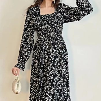 Fleepmart Long Sleeve Casual Dress Women Chiffon Dresses Autumn Spring A-line Printed Floral Elastic Chest Lace Up Midi Dresses Vestidos