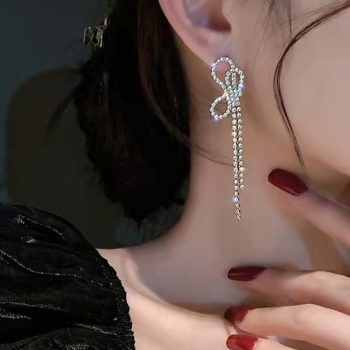 Fleepmart Shiny Rhinestone Bow Tassel Long Earring 2022Temperament Clip On Earrings For Women Without Piercing Ear Clip Jewelry