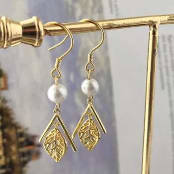 Fleepmart 925 Sterling Silver Palace Retro Long Pearl Leaf Earrings Women Light Luxury Temperament Wedding Party Jewelry Accessories