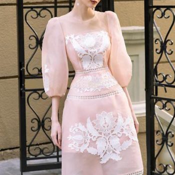 Fleepmart Square Collar Dresses for Women Party Embroidery Elegant Lace Lantern Sleeve Pink High Waist Summer Spring 2022 Woman Dress Robe