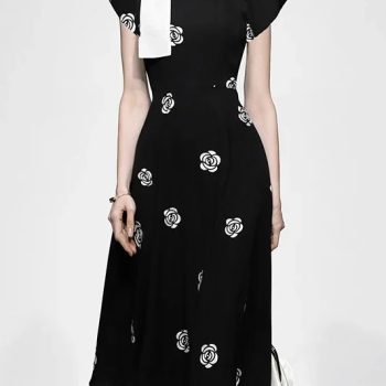 Fleepmart 2023 Summer Formal Black Rose Embroidery Puff Sleeve Dresses Fashion Elegant Slim Bodycon A-line Party Dress