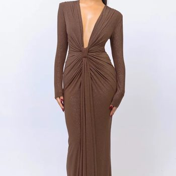Fleepmart Sexy Deep V Long Sleeve Lace Up Pleated Women Bodycon Split Metal Color Winter Party Club Evening Vestidos