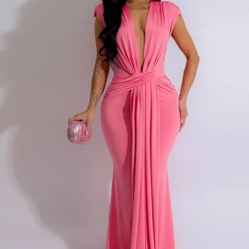 Fleepmart Summer Solid Color High Waisted Long Dress 2024 New Elegant Deep V-neck Sexy Short Sleeved Dress