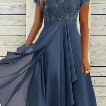 Fleepmart Vestidos Largos Dresses For Women Elegant Lace Chiffon Flowy Dress Evening Party Gown V Neck Short Sleeve Lace Chiffon Dress