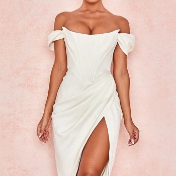 Fleepmart Satin Dress White Ladies Sexy Dress Backless Push Up Boned Dresses Elastic High Waist Zip Split Vestidos Birthday Party