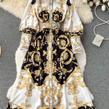 Fleepmart 2022 Fashion Runway Baroque Maxi Dress Women Long Lantern Sleeve Buttons Down Golden Flower Print Elegant