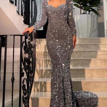 fleepmart Stretch Sequined Maxi Dress Full Sleeve V Neck Mermaid Evening Night Long Party Dress Grey Black Burgundy