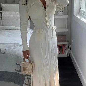 Fleepmart Knitted Mermaid Dress Women Turn-down Collar Long Sleeve Female Long Dresses 2024 Autumn Winter Slim Hip Package Lady Robes
