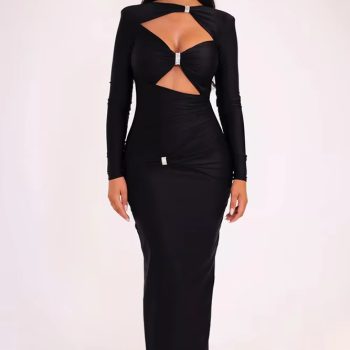 Fleepmart Elegant Hollow Out Long Sleeve Sexy Maxi Dress For Women Solid Color Slim Fit Cut Out Club Party Long Dress New