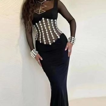 Fleepmart High Quality Women Long Sleeve Sexy Big Crystal Bodycon Long Bandage Dress Celebrate Evening Party Cocktail Christmas Dress
