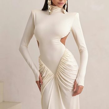 Fleepmart Shirring Sheath Women Maxi Dresses High Street Classic Full Sleeve Straight Shoulder Backless Vestidos Mujer Evening Wear