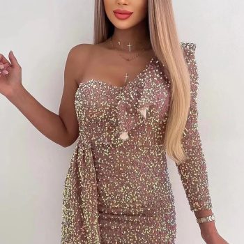 Fleepmart 2023 Fashion Women Sexy Short Sequin Party Dress One Shoulder Ruffles Evening Dress
