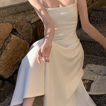 Fleepmart 2024 Summer Evening Party White Midi Dress Office Lady Slim Sexy Sleeveless Strap Dress Beach Style Women One Piece Dress Korean