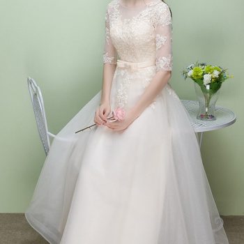 Fleepmart New Arrival Gery Luxury O-Neck Half Sleeve Embroidery Lace up Evening Dresses A-line Tea Length Formal Dress