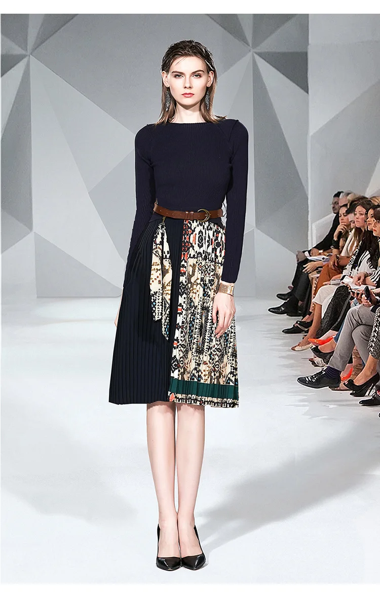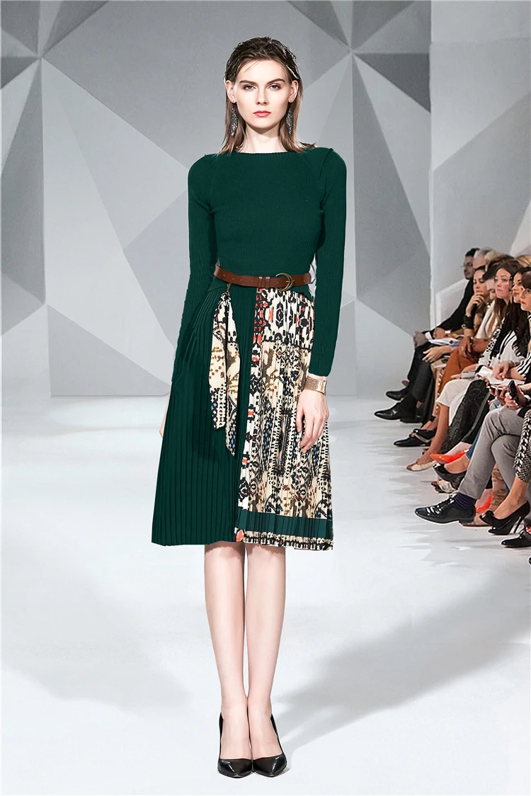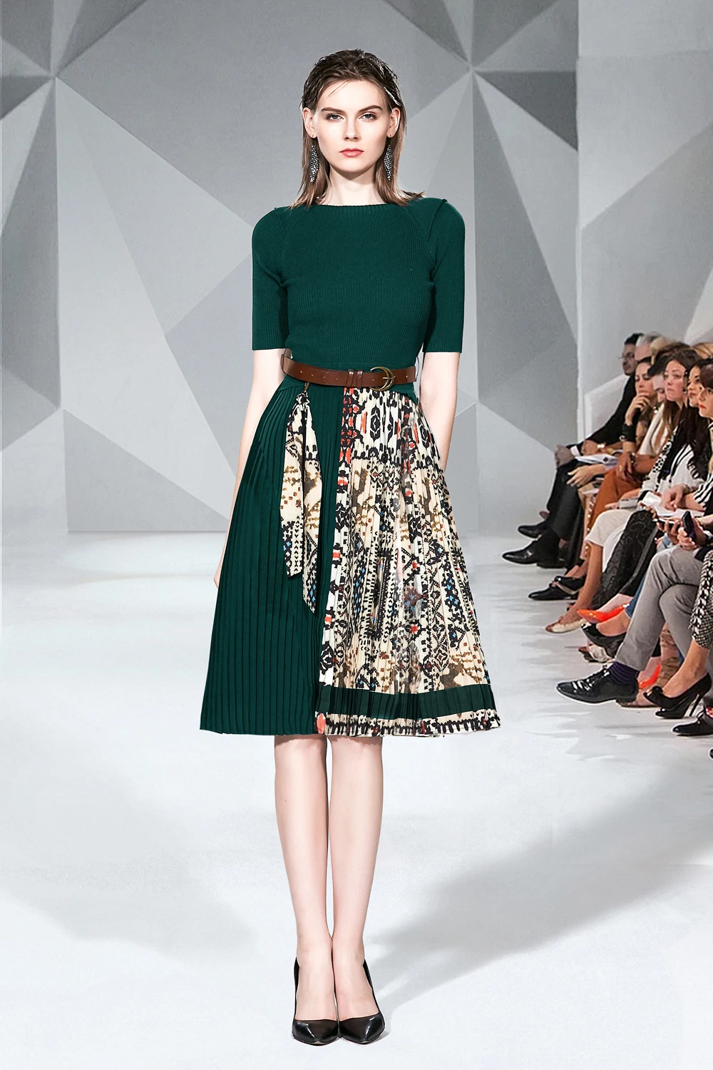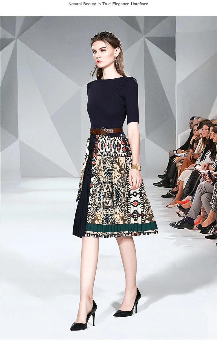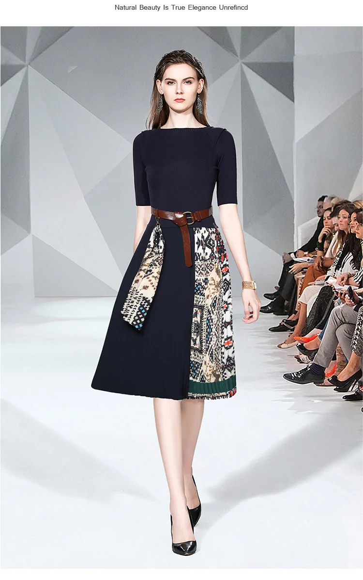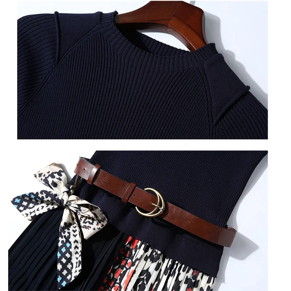 Fleepmart Female Designer Pleated Midi Dress 2022 Runway Knitted Patchwork Floral Print O Neck Short Sleeve Bow Sashes Party Dress