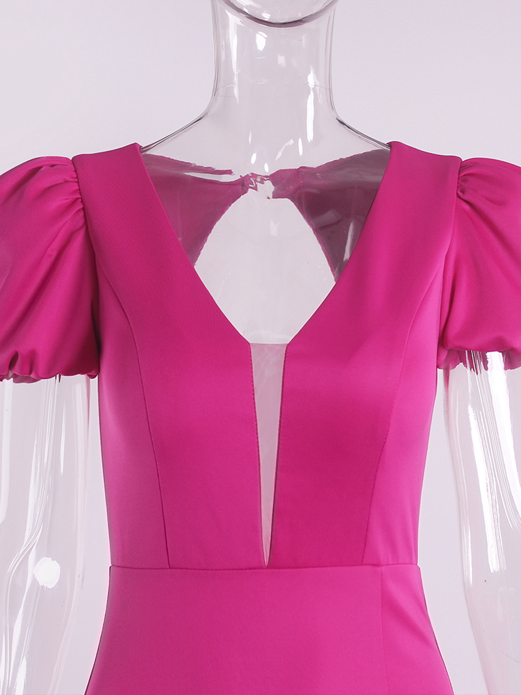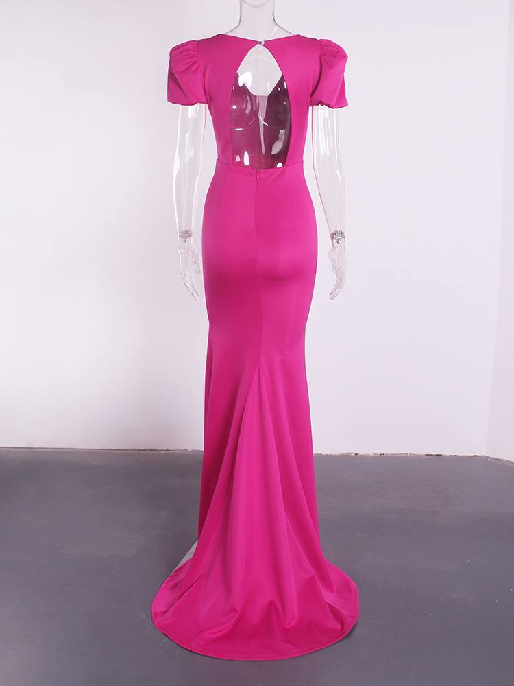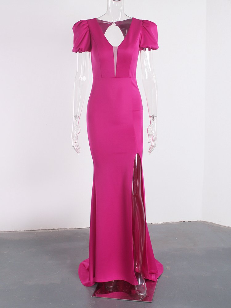 Fkeepmart Short Puff Sleeve V Neck Front Slit Backless Floor Length Summer Evening Party Prom Maxi Dress Gown