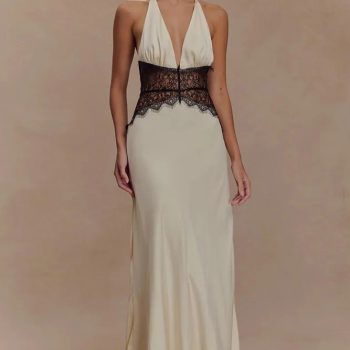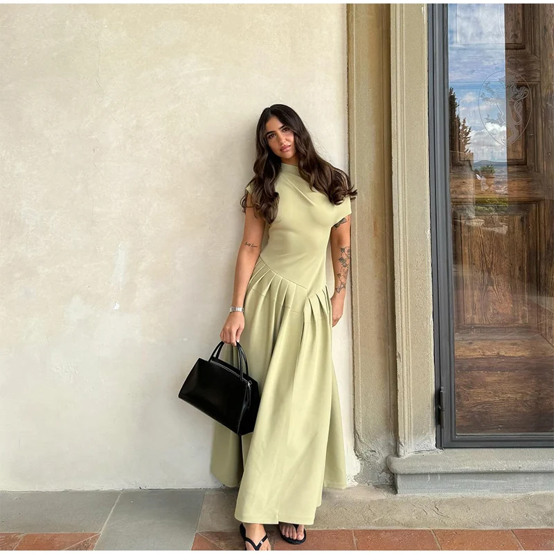 fleepmart Diagonal Collar Knit Patchwork Maxi Dress For Women Elegant Short Sleeve Pleated A-line Dresses 2024 Summer Lady Streetwear Robe