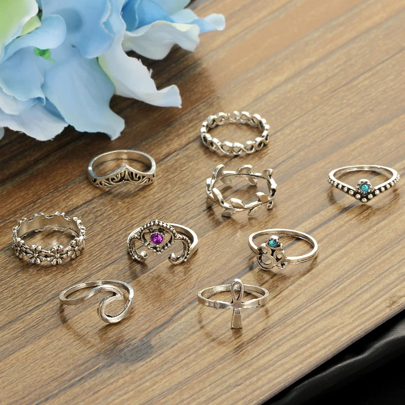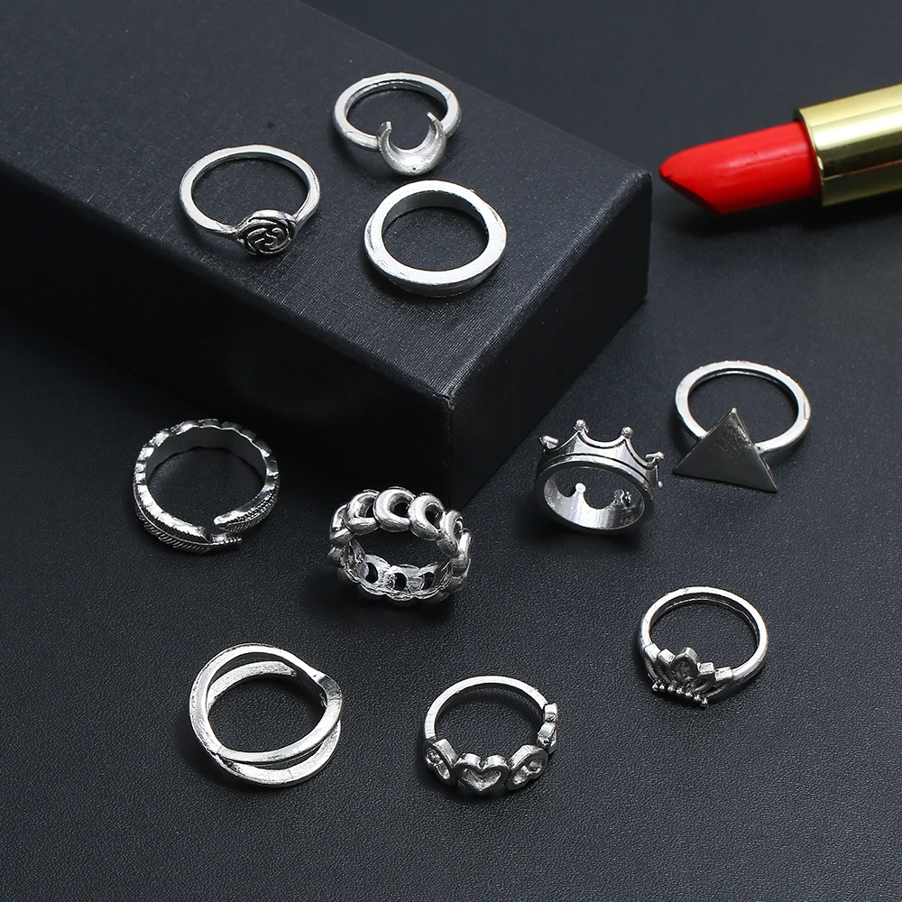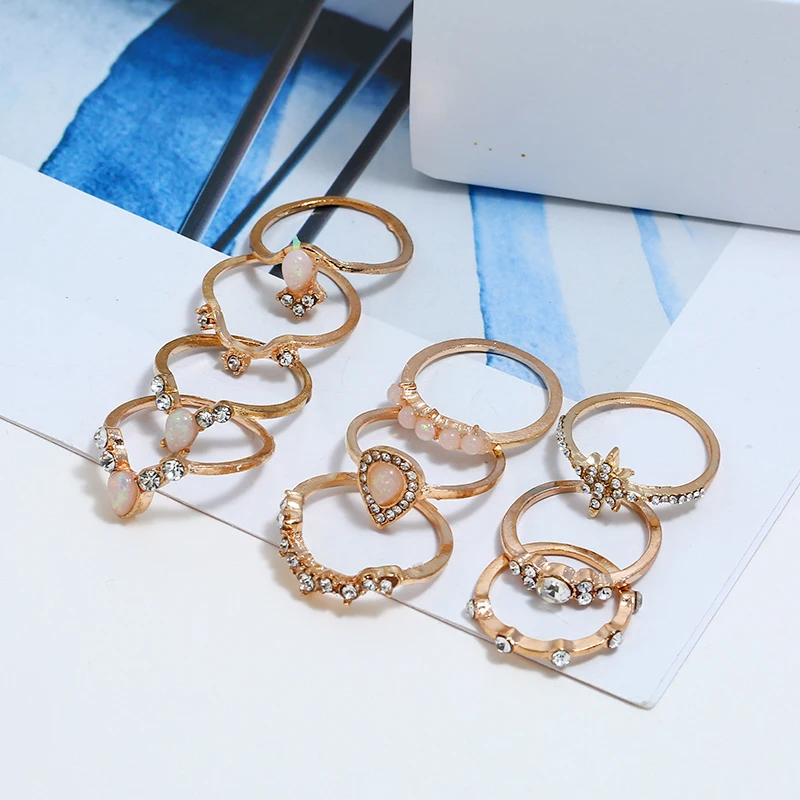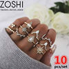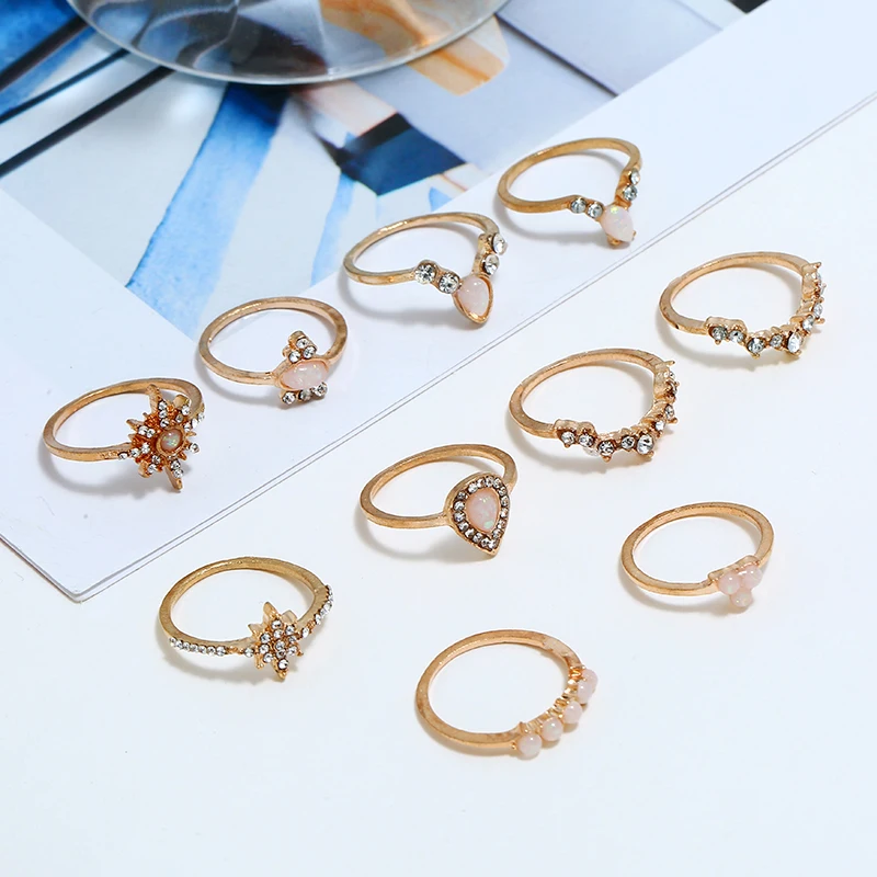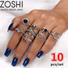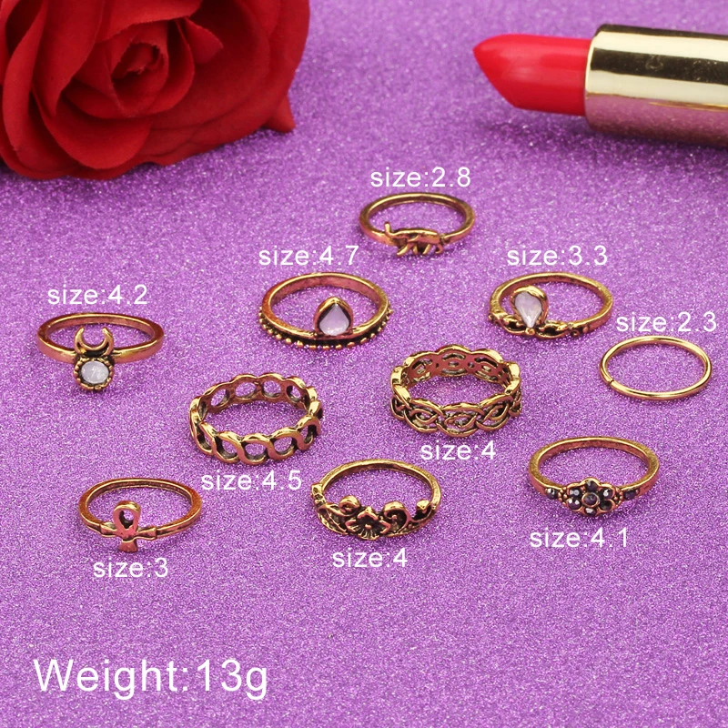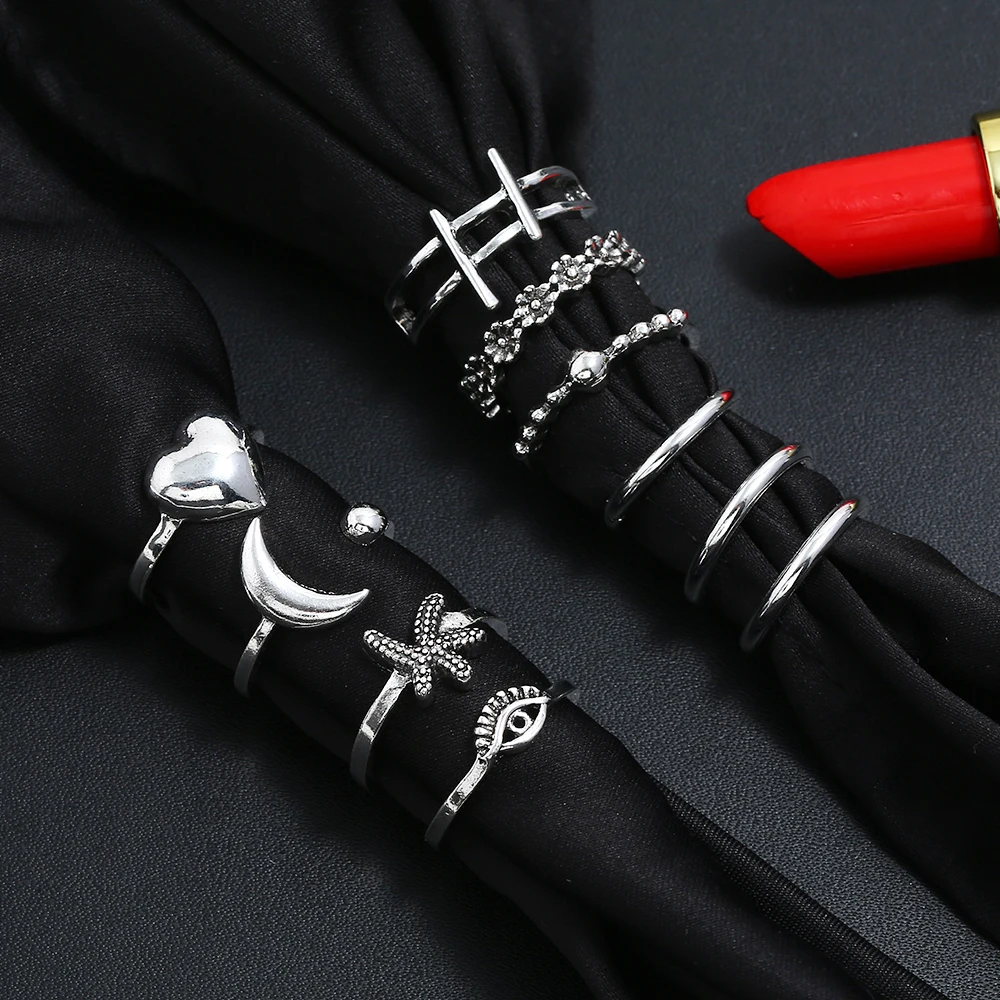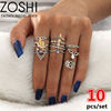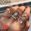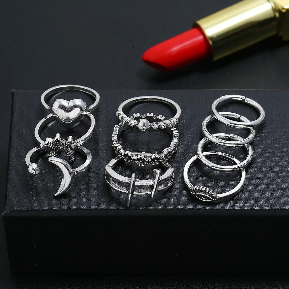 Fleepmart 10Pcs/set Bronze Plated Ring Set Heart Moon Starfish Charms Flower Eye Geometric Knuckle Finger Rings Crystal Women Fashion Ring