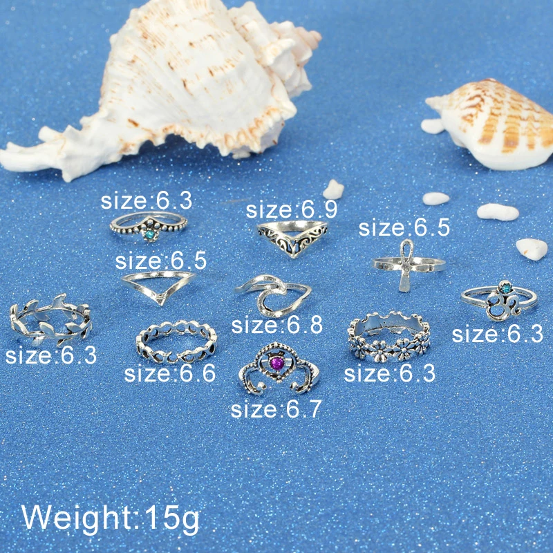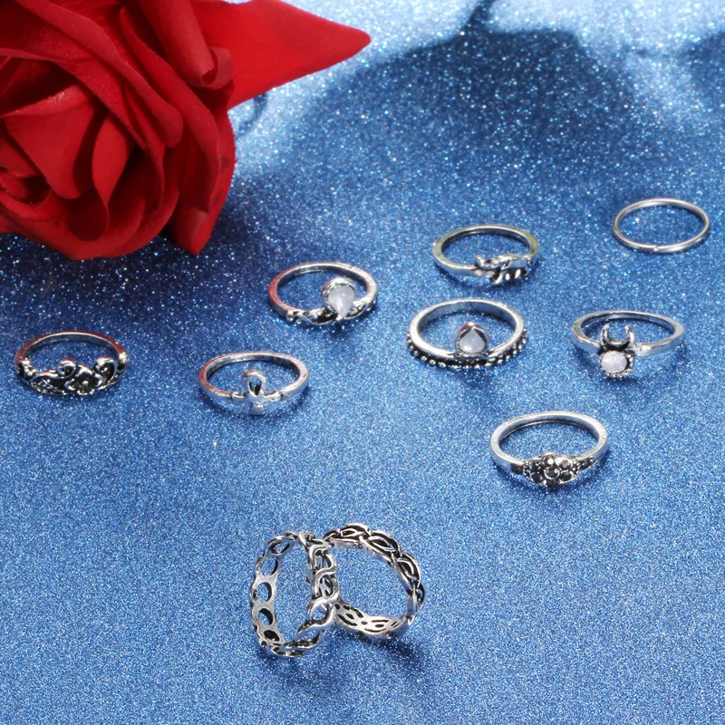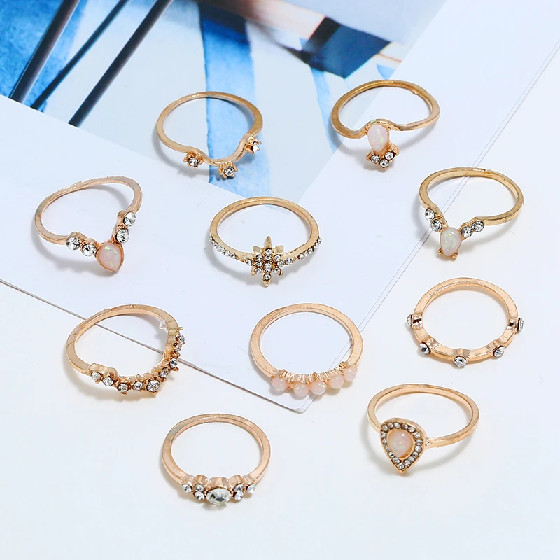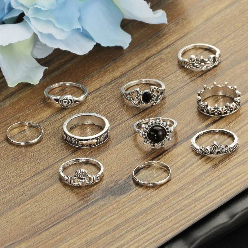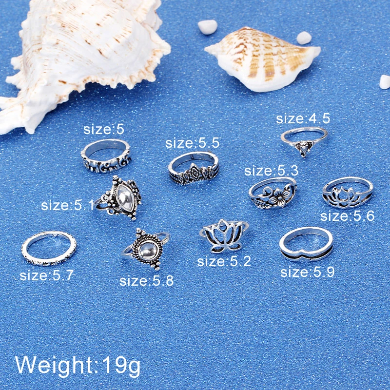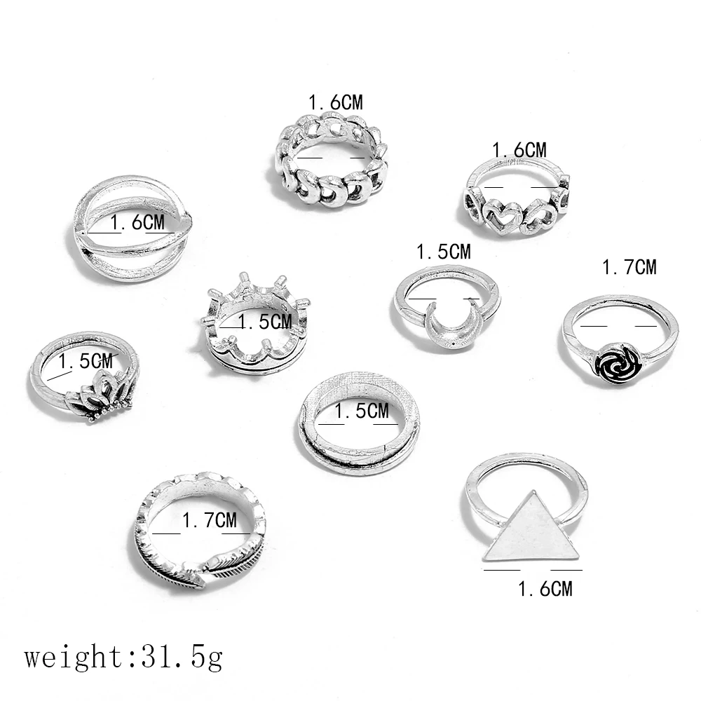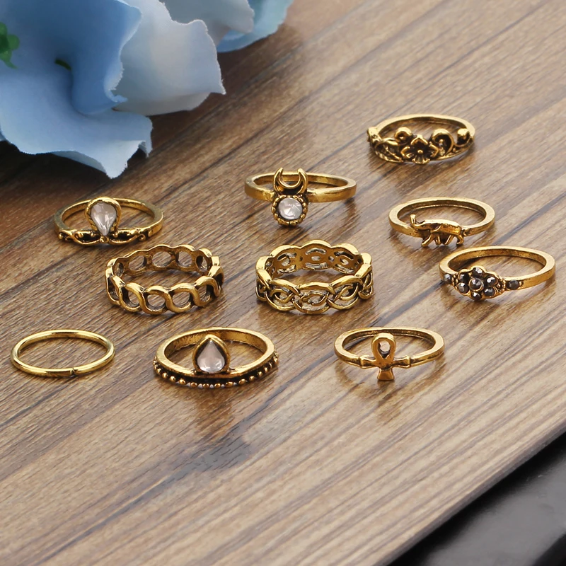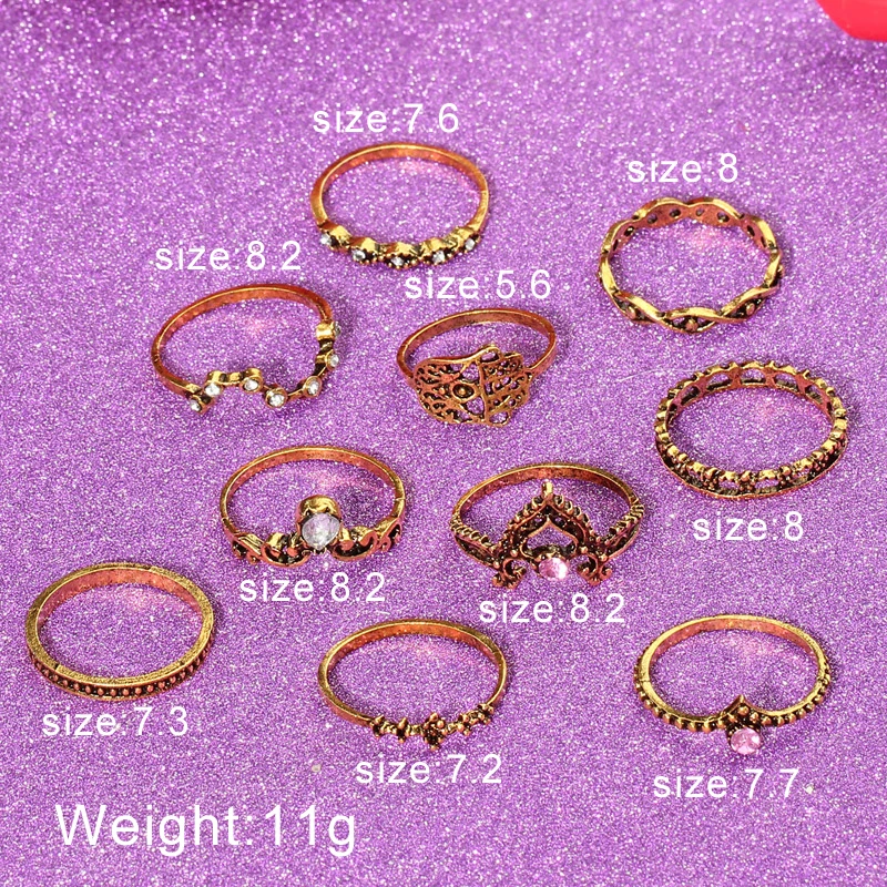 Fleepmart 10Pcs/set Bronze Plated Ring Set Heart Moon Starfish Charms Flower Eye Geometric Knuckle Finger Rings Crystal Women Fashion Ring