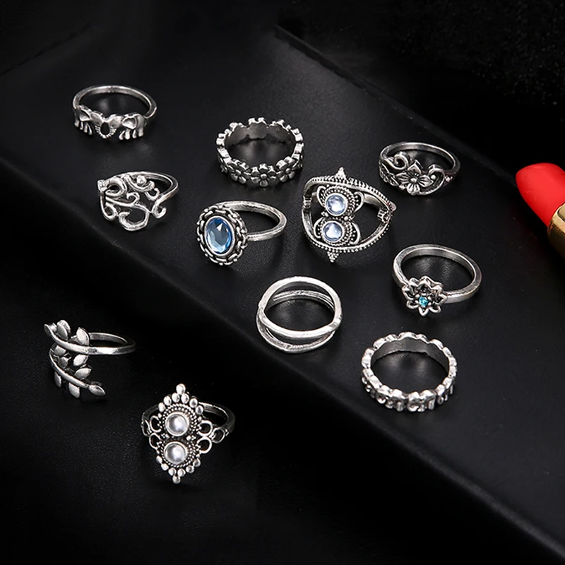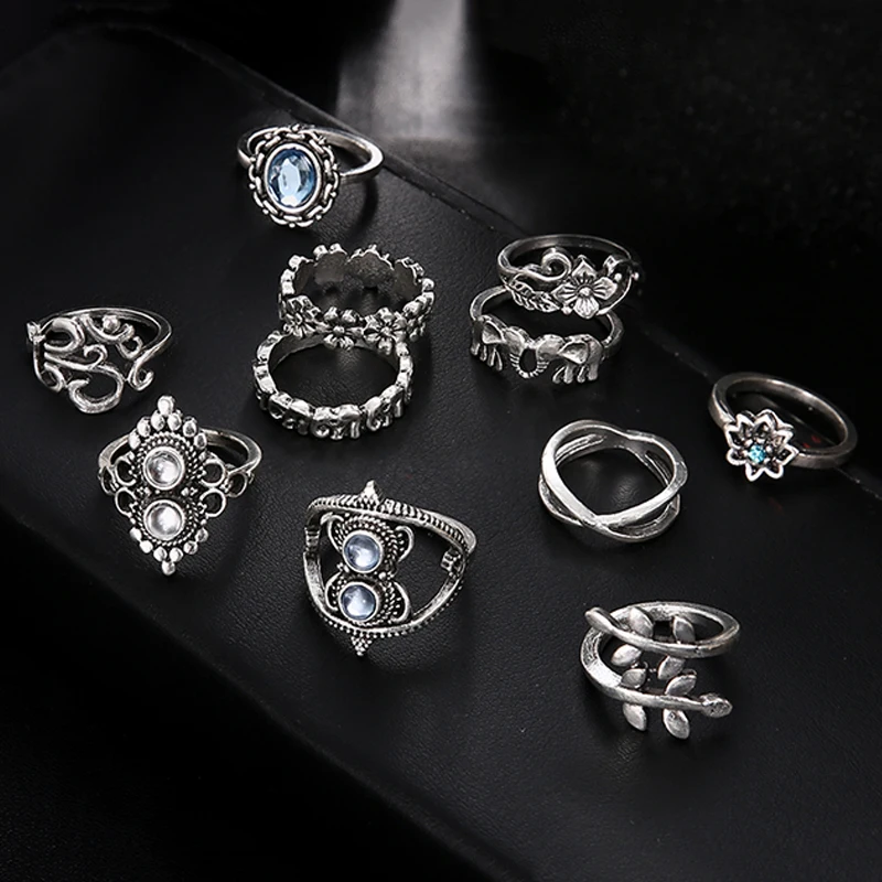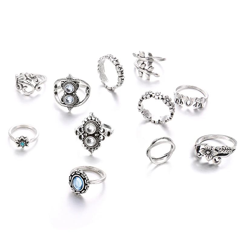 Fleepmart 11 Pcs/Set Bohemian retro elephant flower leaves cross exaggerated gem Silver Color ring set women Wedding Party Jewelry