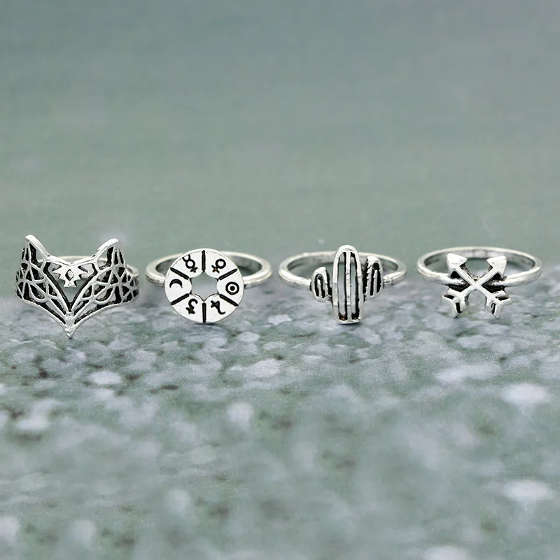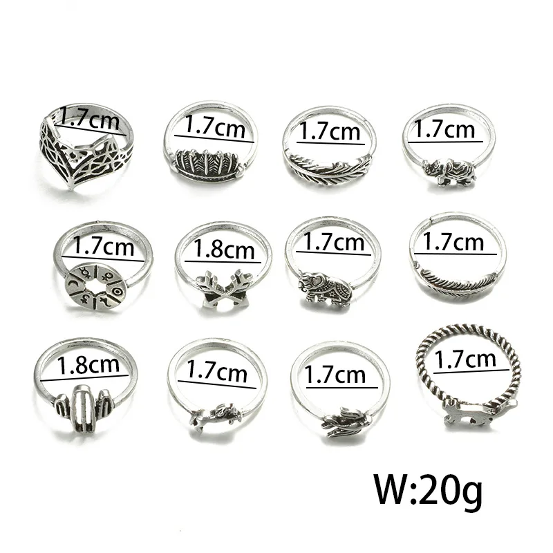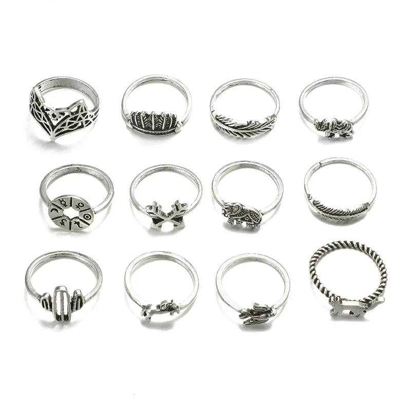 Fleepmart 12pcs/Set Bohemia Antique Silver Color Rings for Women Arrow Elephant Fox Lion Pony Pattern Animal Jewelry кольцо