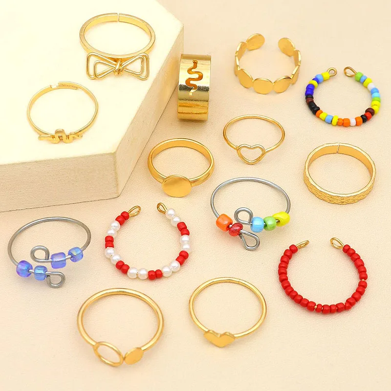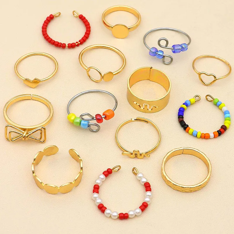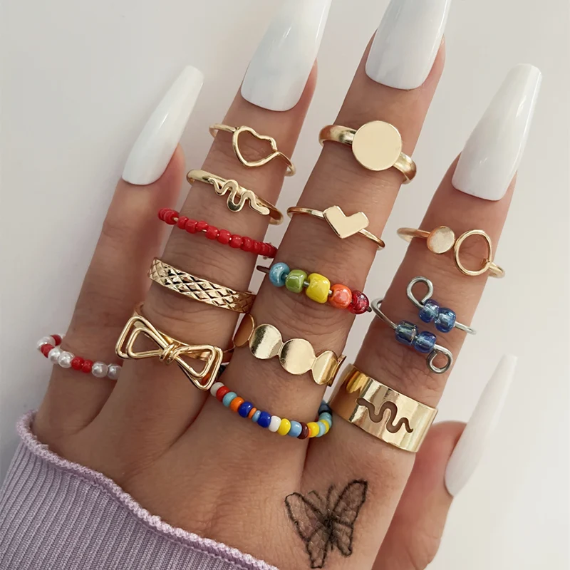 Fleepmart 14 Pcs/Set Fashion Rings Set Bow Peach Heart Snake Round Multicolor Beaded Gold Color Knuckle Ring Women Sweet Jewelry