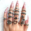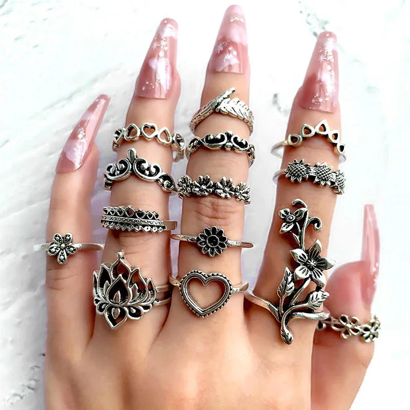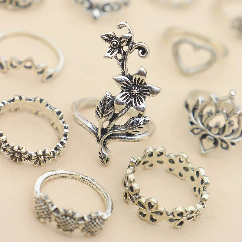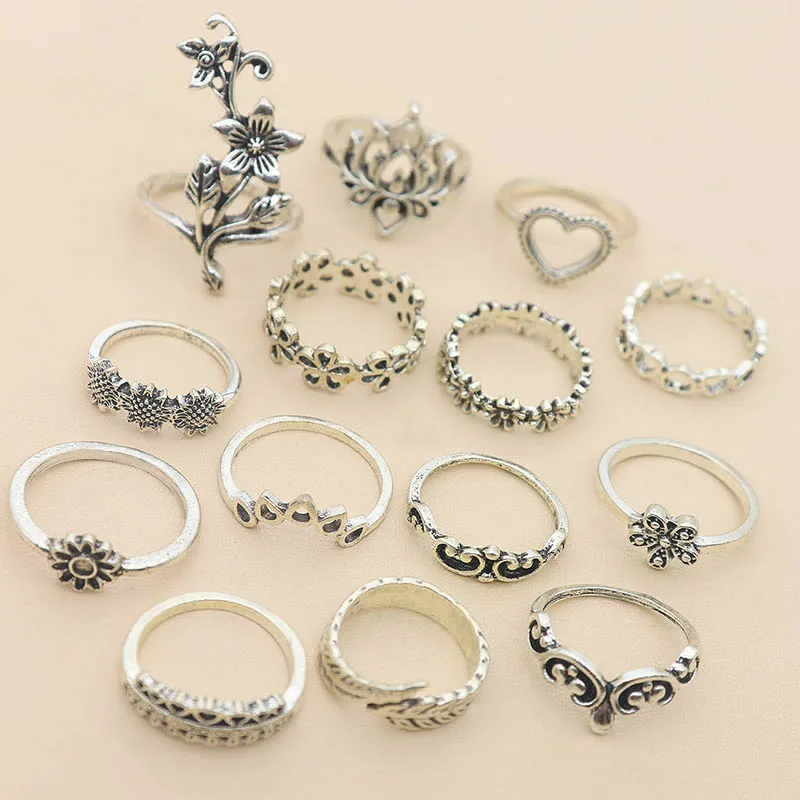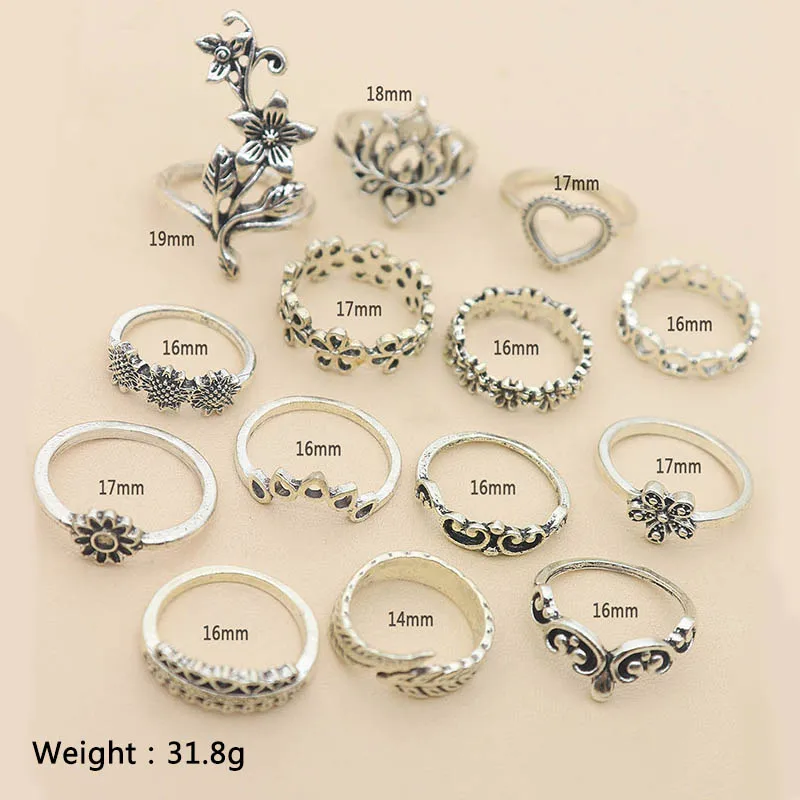 Fleepmart 14 Pcs/Set Women Rings Vintage Leaf Flower Hollow Peach Heart Silver Color Finger Joint Ring Birthday Party Jewelry Gifts