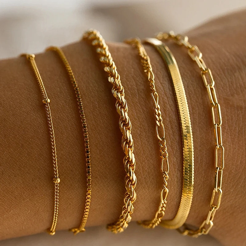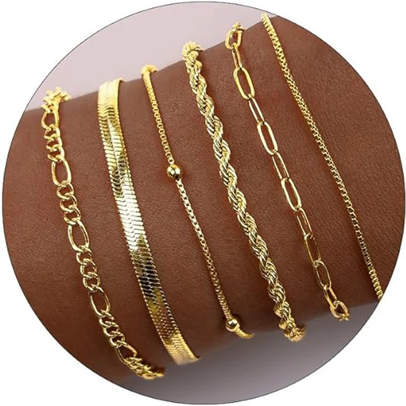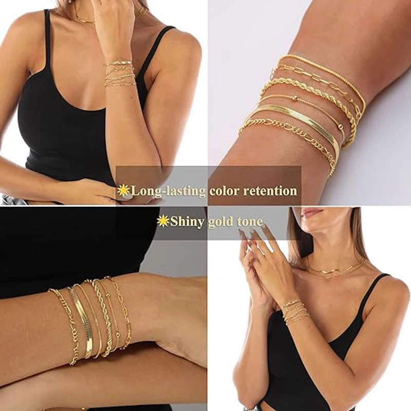 Fleepmart 14k Gold Plated Dainty Bracelet Stack Set Cute Stackable Beaded Tennis Snake Cuban Link Chain Bracelets Gifts for Teen Girls