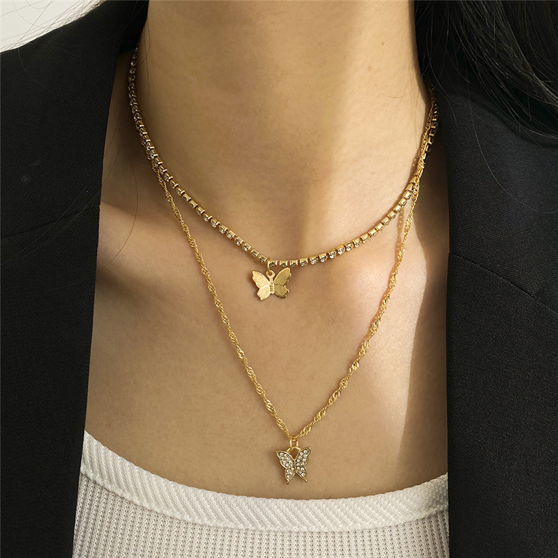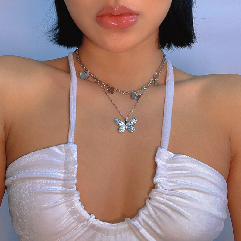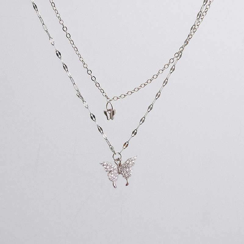 Fleepmart 17KM New Korean Silver Plated Shiny Butterfly Necklace Ladies Exquisite Double Layer Clavicle Chain Necklace Jewelry Gift