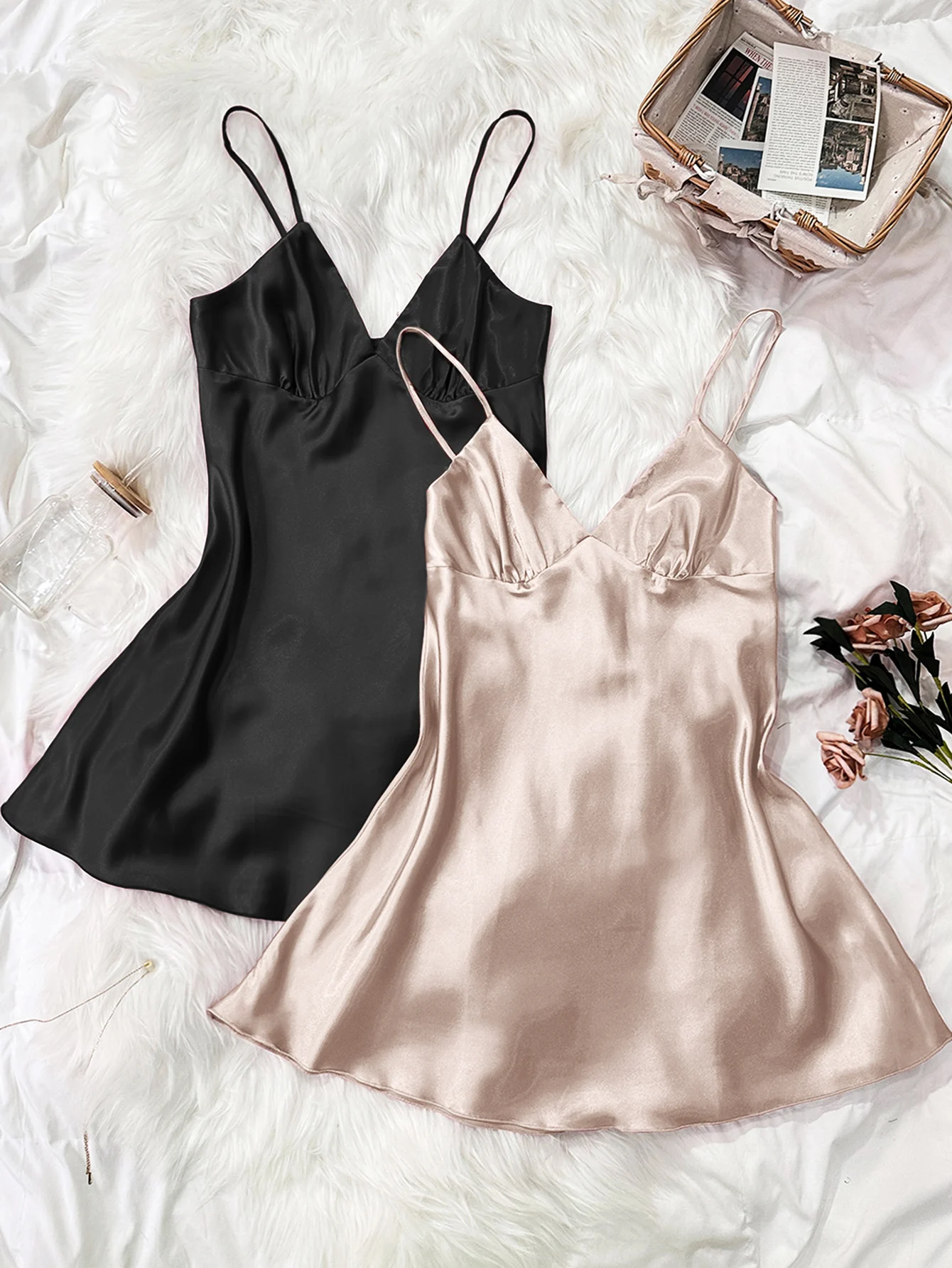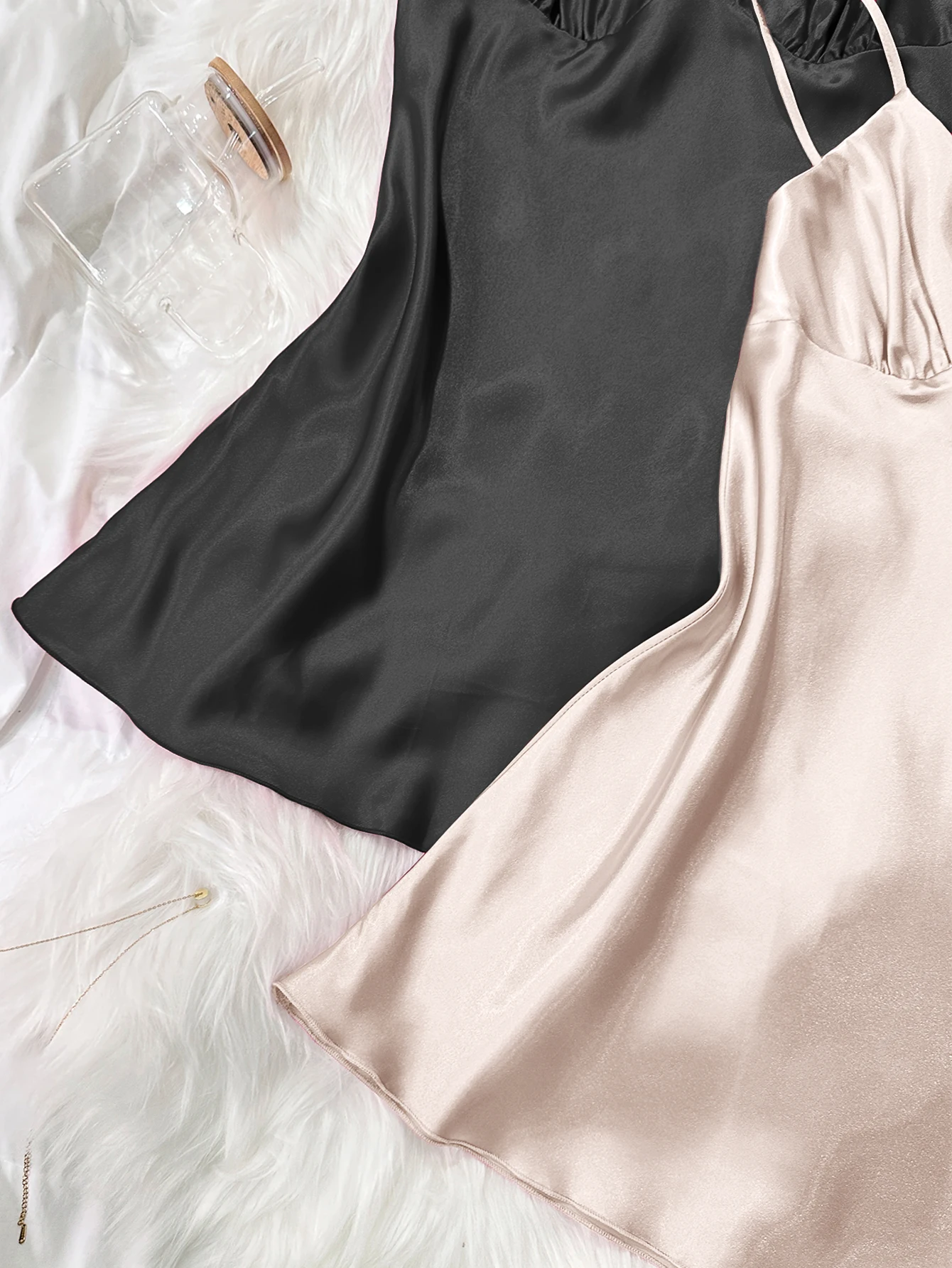 Fleepmart 2 Pcs Solid V Neck Nightdress Elegant Spaghetti Strap Sleep Dress Women’s Sleepwear Dresses