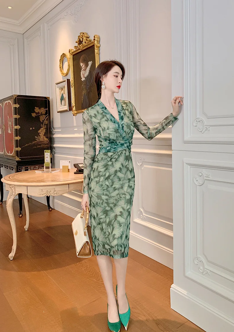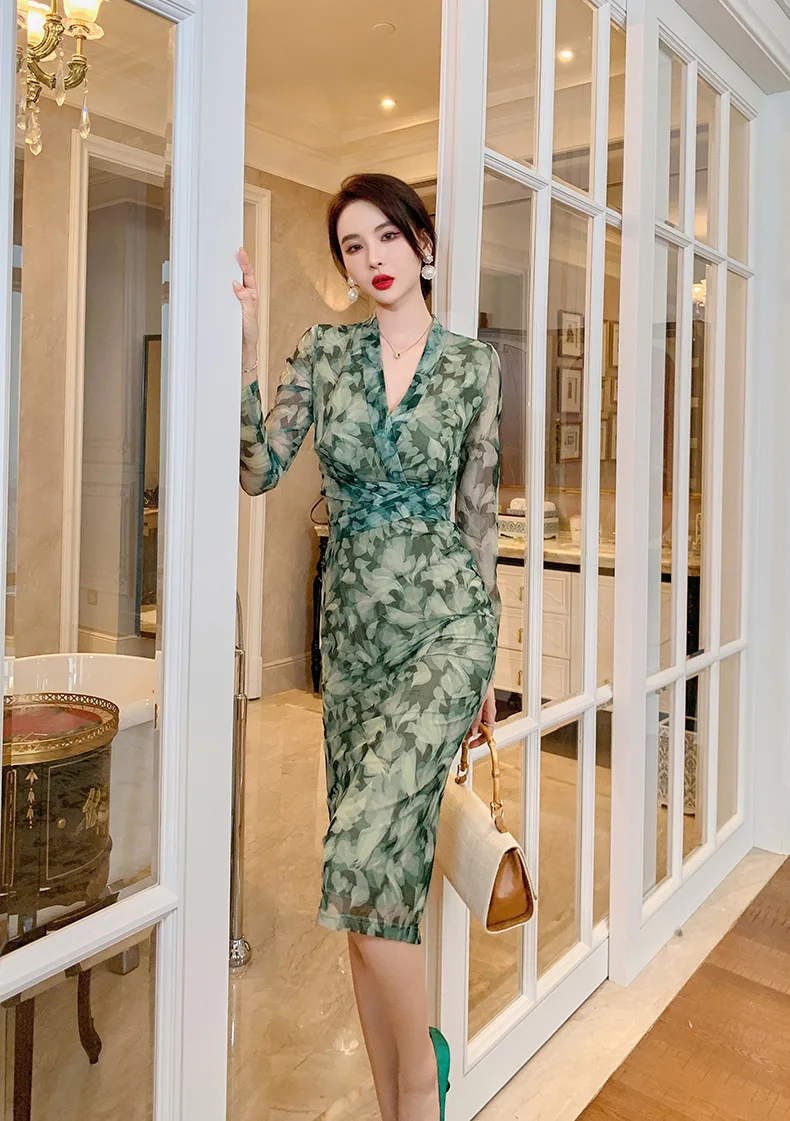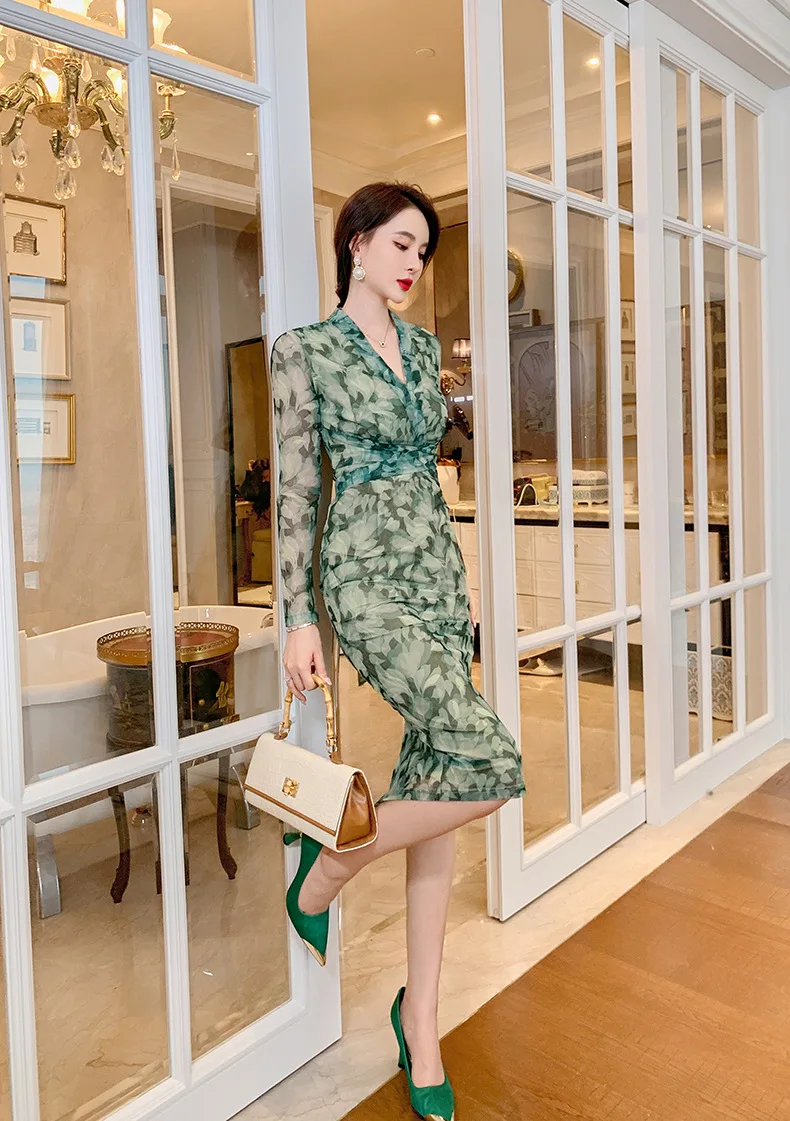 Fleepmart 2021 autumn new women’s sexy green print lace-up hip mesh dress Office Lady COTTON Zippers