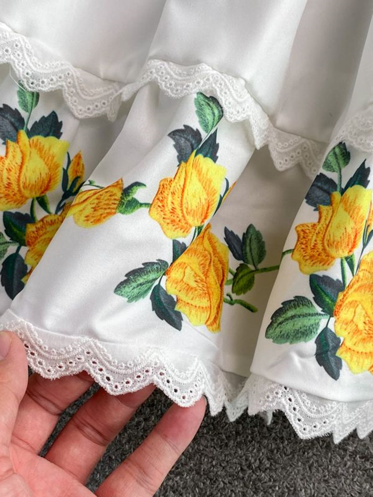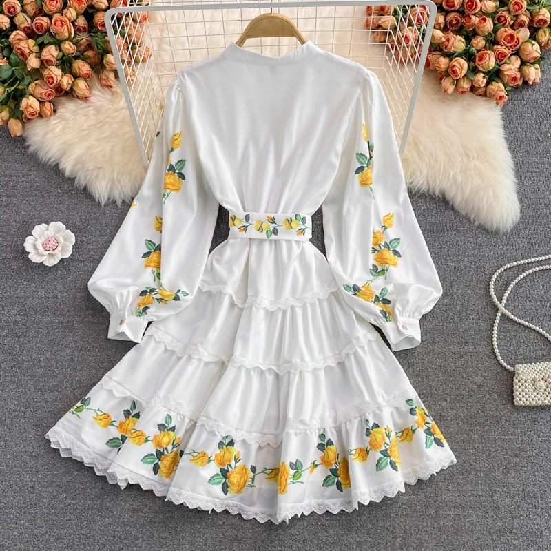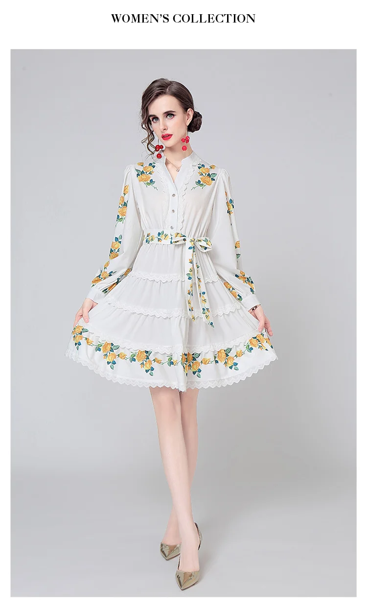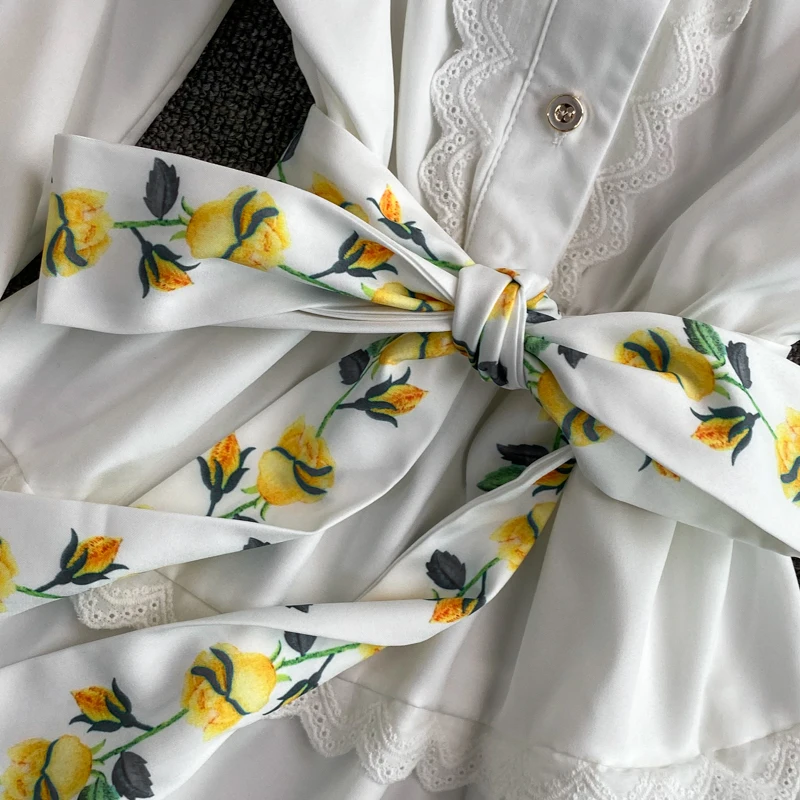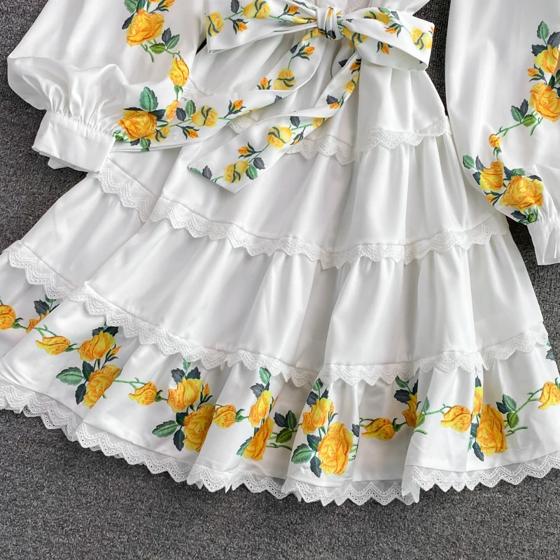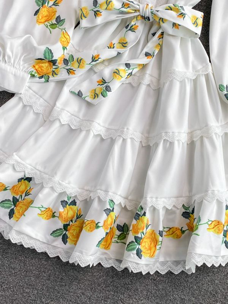 Fleepmart 2022 Autumn Water Soluble Lace Trims Print Flower Dress Women Long Puff Sleeve V Neck Cascading Ruffles Lace Up White Vestidos