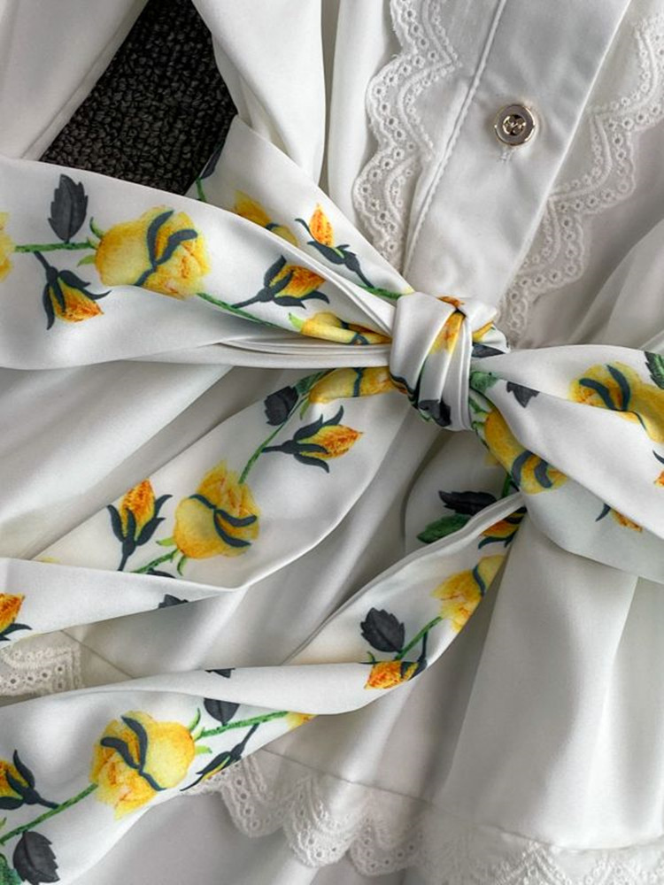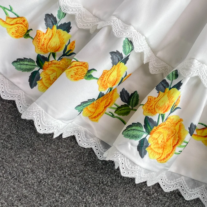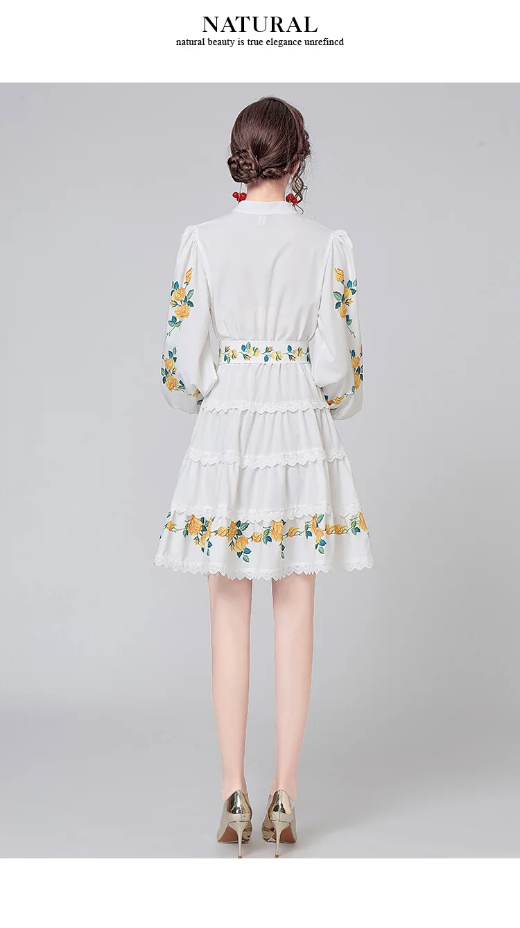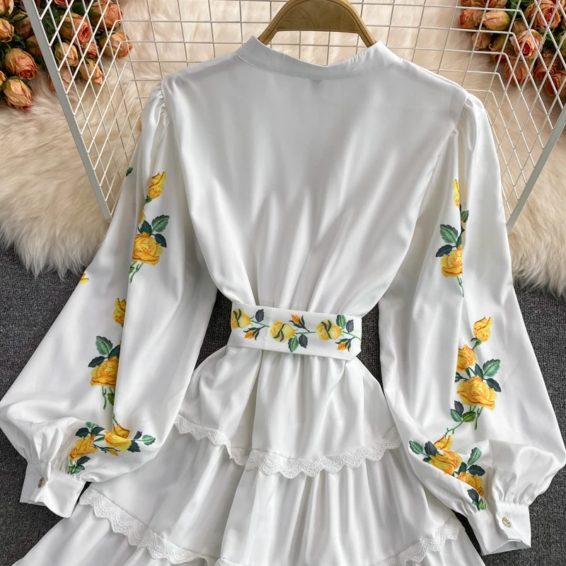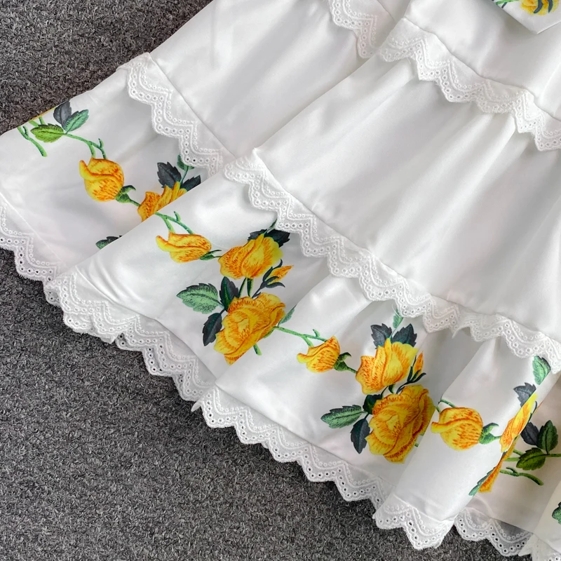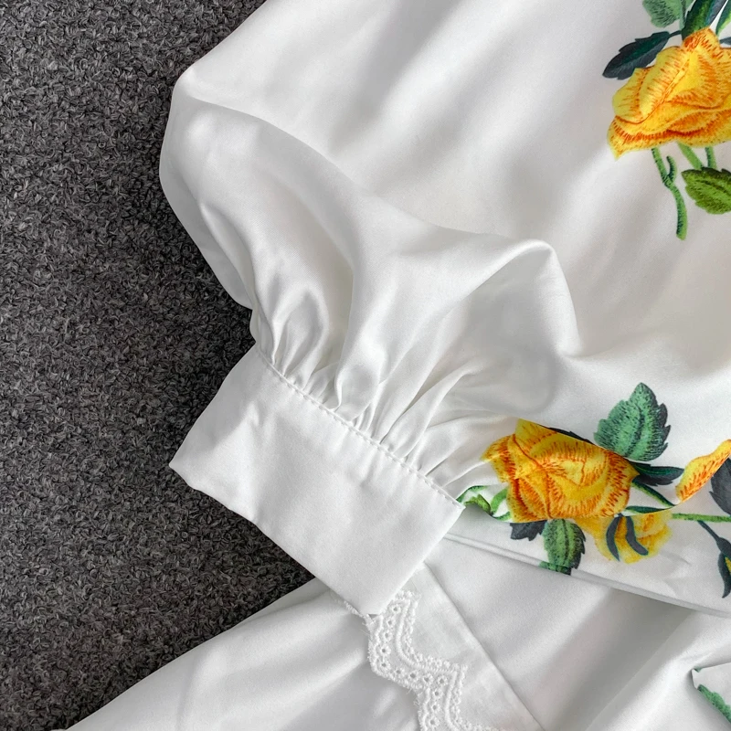 Fleepmart 2022 Autumn Water Soluble Lace Trims Print Flower Dress Women Long Puff Sleeve V Neck Cascading Ruffles Lace Up White Vestidos