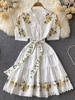 Fleepmart 2022 Autumn Water Soluble Lace Trims Print Flower Dress Women Long Puff Sleeve V Neck Cascading Ruffles Lace Up White Vestidos