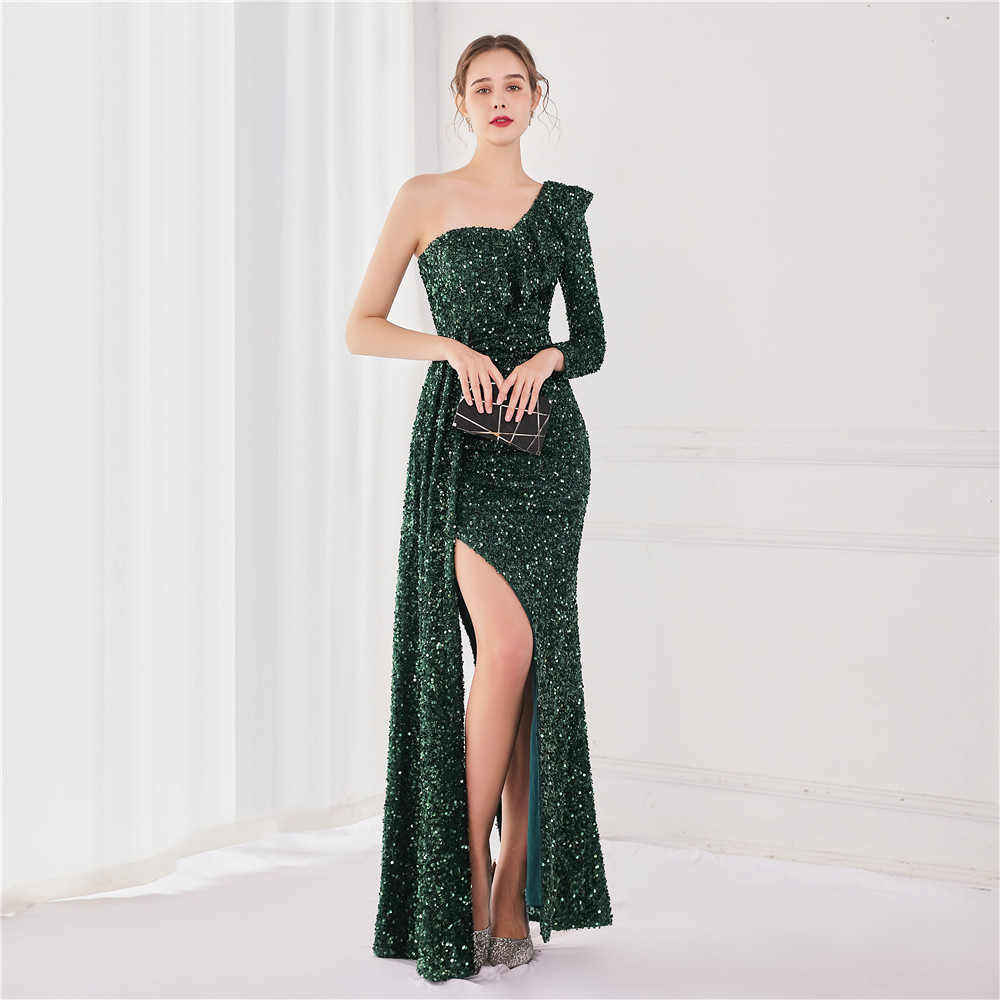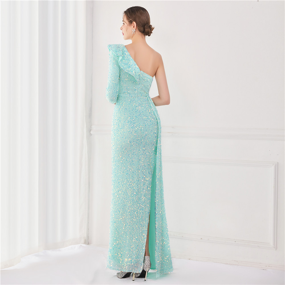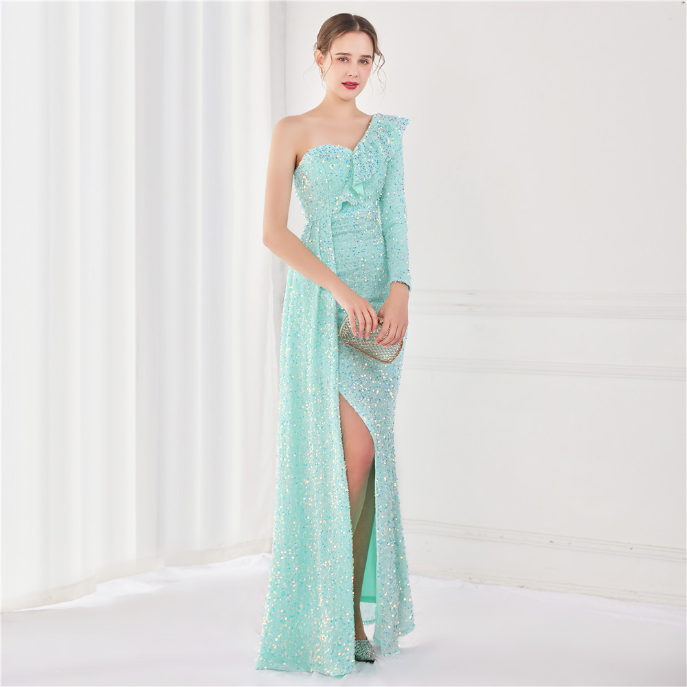 Fleepmart 2022 Fashion Women Light Blue Sequin Party Dress One Shoulder Ruffles Evening Dress Maxi Sexy Side Split Long Dress