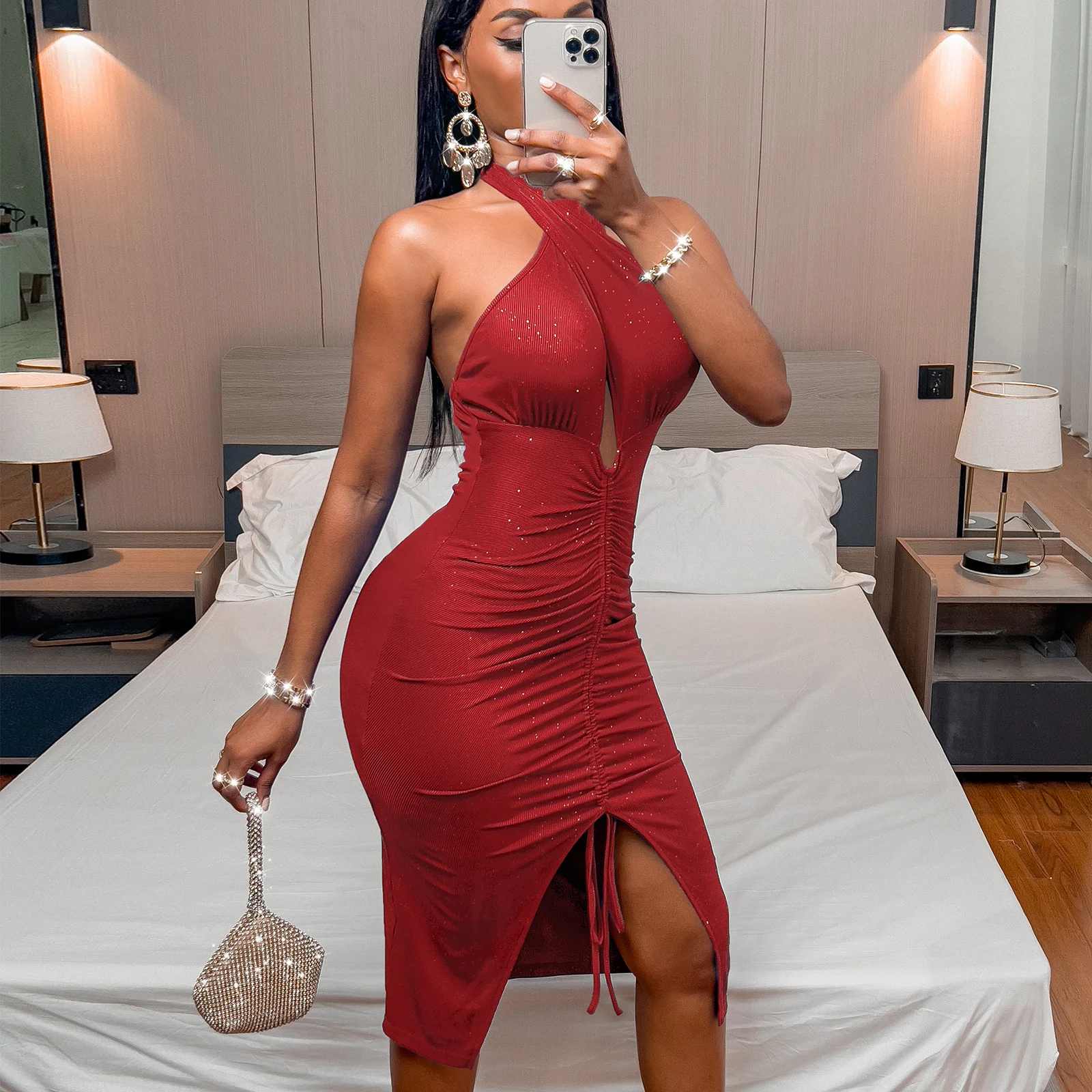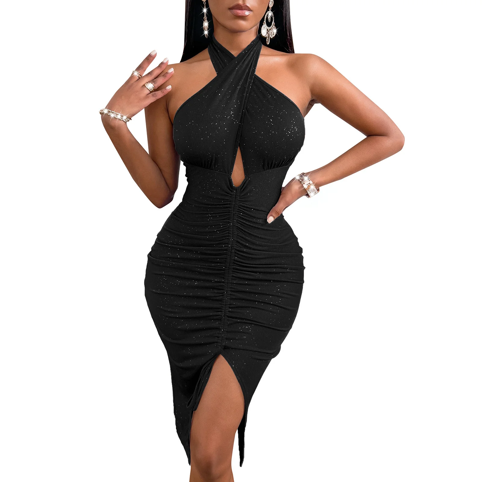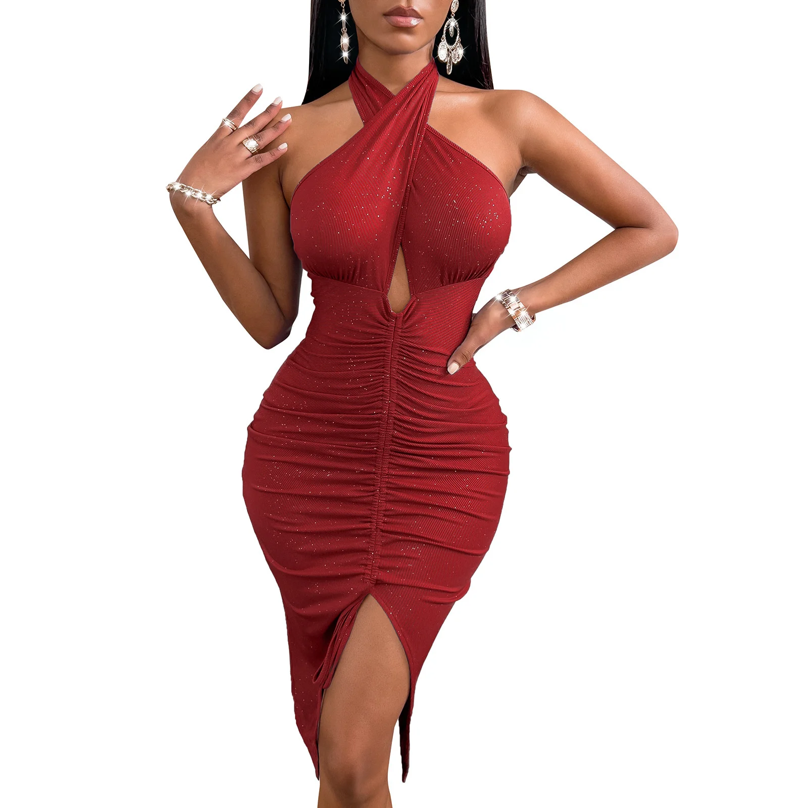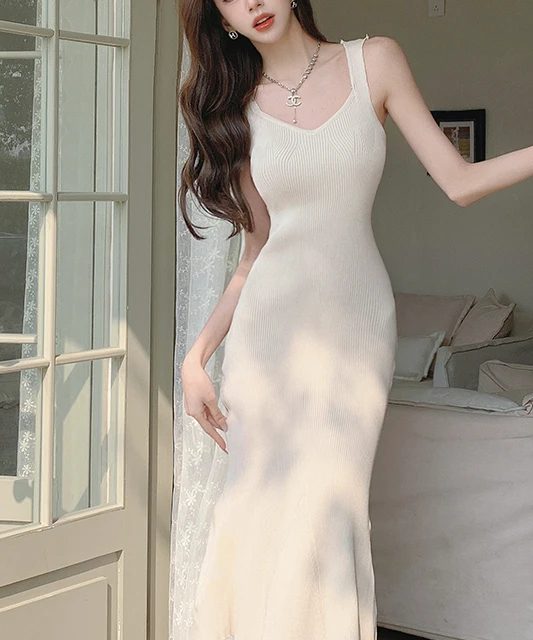 Fleepmart 2022 New Fashion Romantic Summer Sexy Bodycon Slit Slim Mid Length Pleated Dress Women Solid Sleeveless Backless Casual Dresses