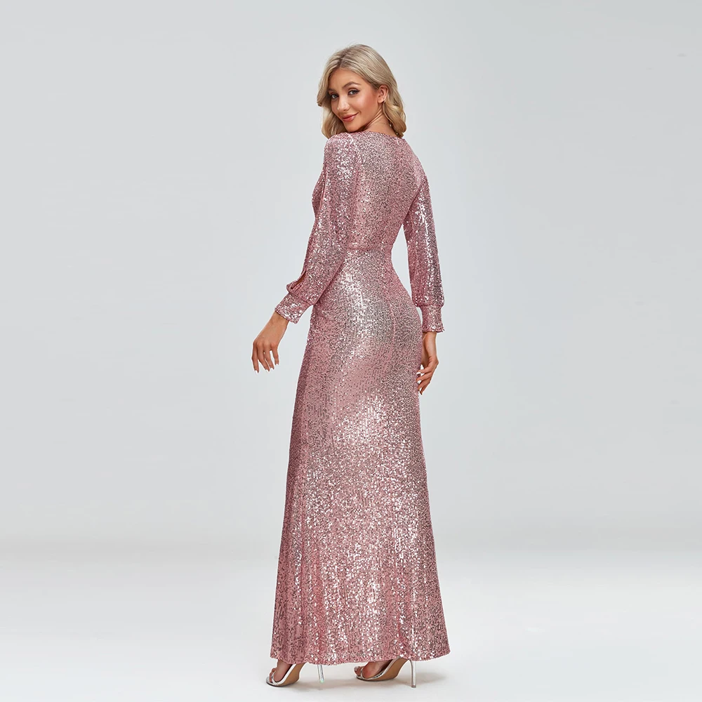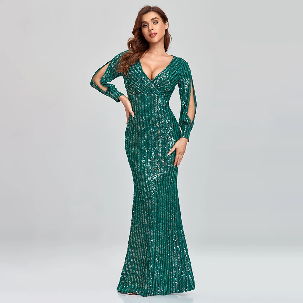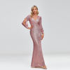 Fleepmart 2022 New Women Elegant V-neck Mermaid Evening Dress Floor Length Formal Prom Party Gown Sequins Long Sleeve Galadress Vestidos