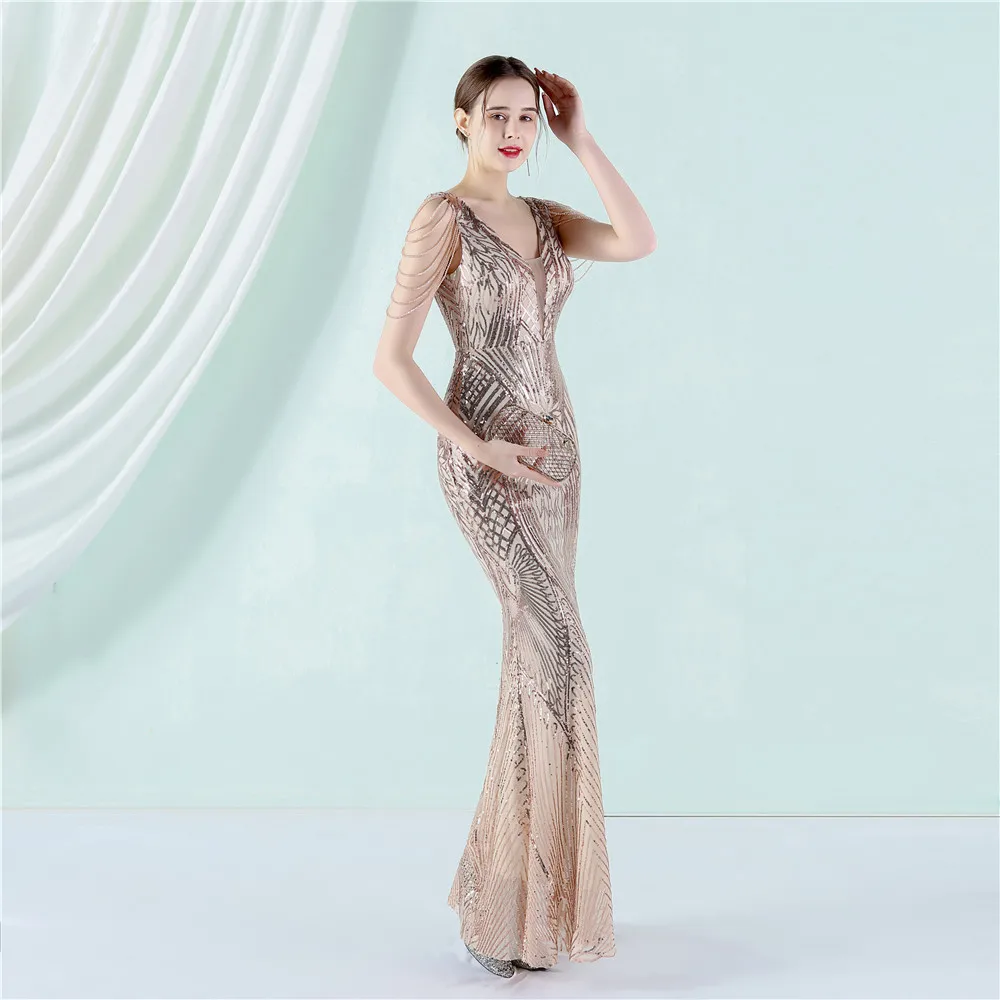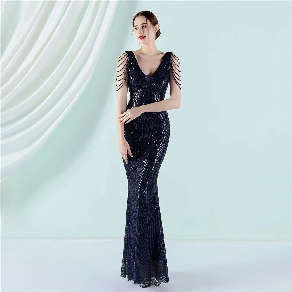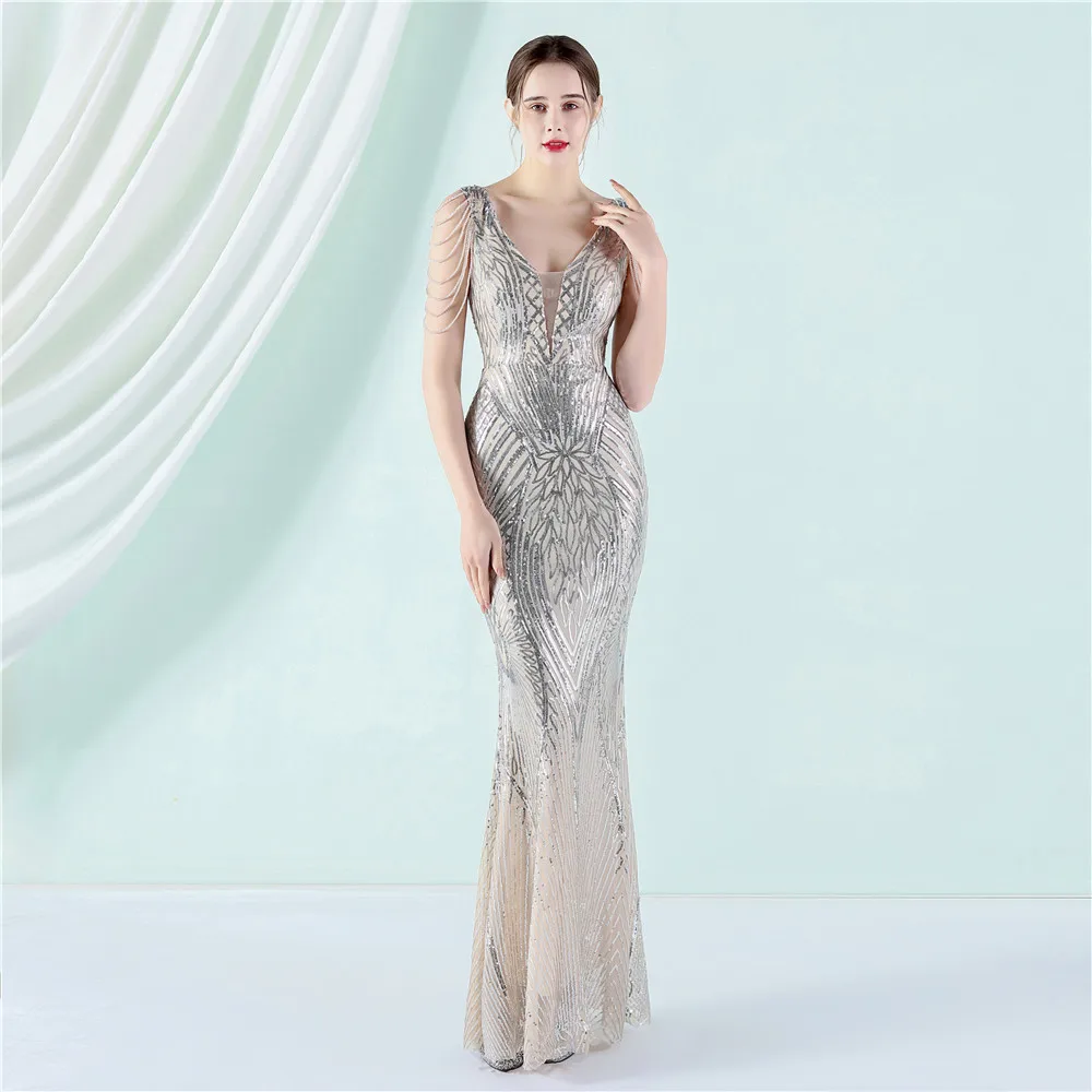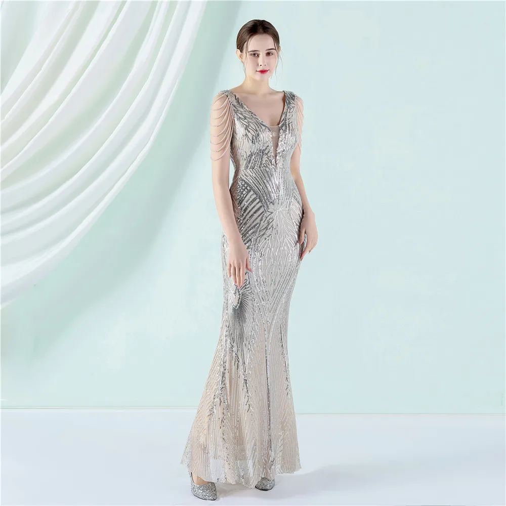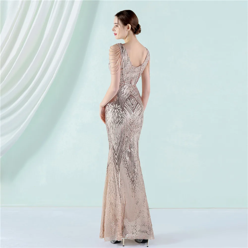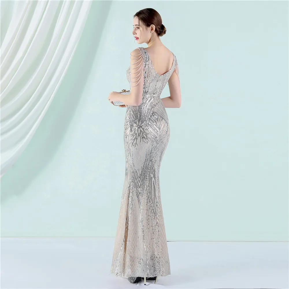 Fleepmart 2022 New Women Elegant V-neck Sleeveless Beading Evening Dress Sexy Mermaid Sequin Women Floor length Party Dress Vestidos
