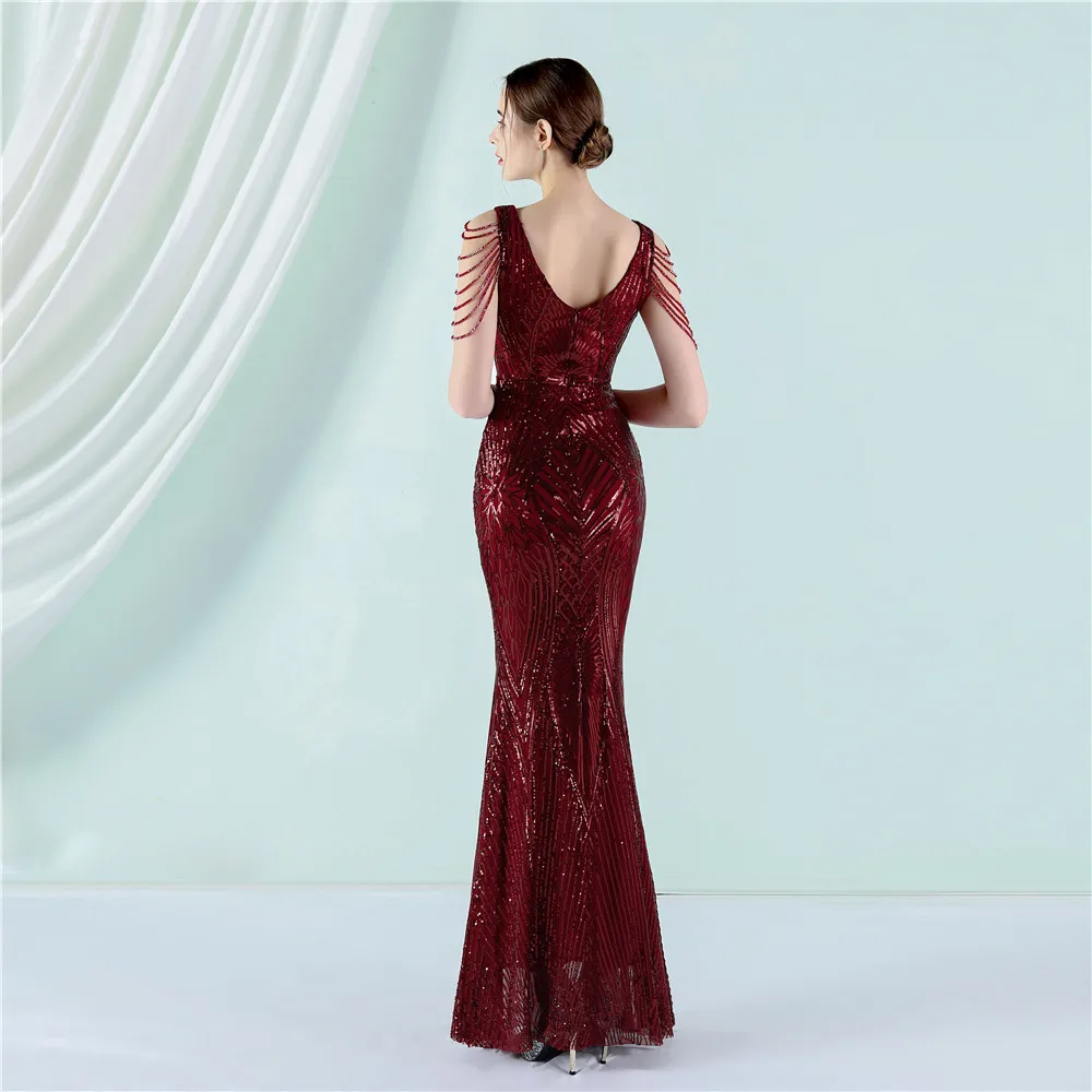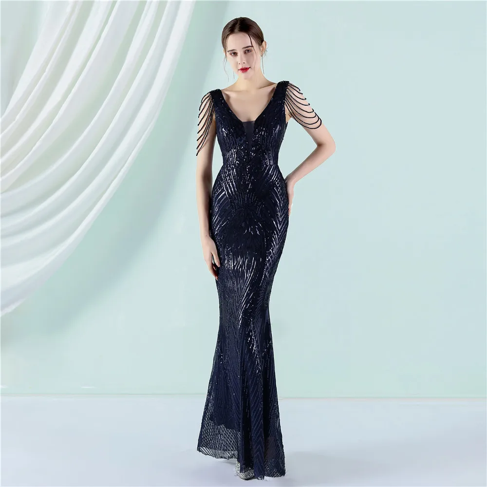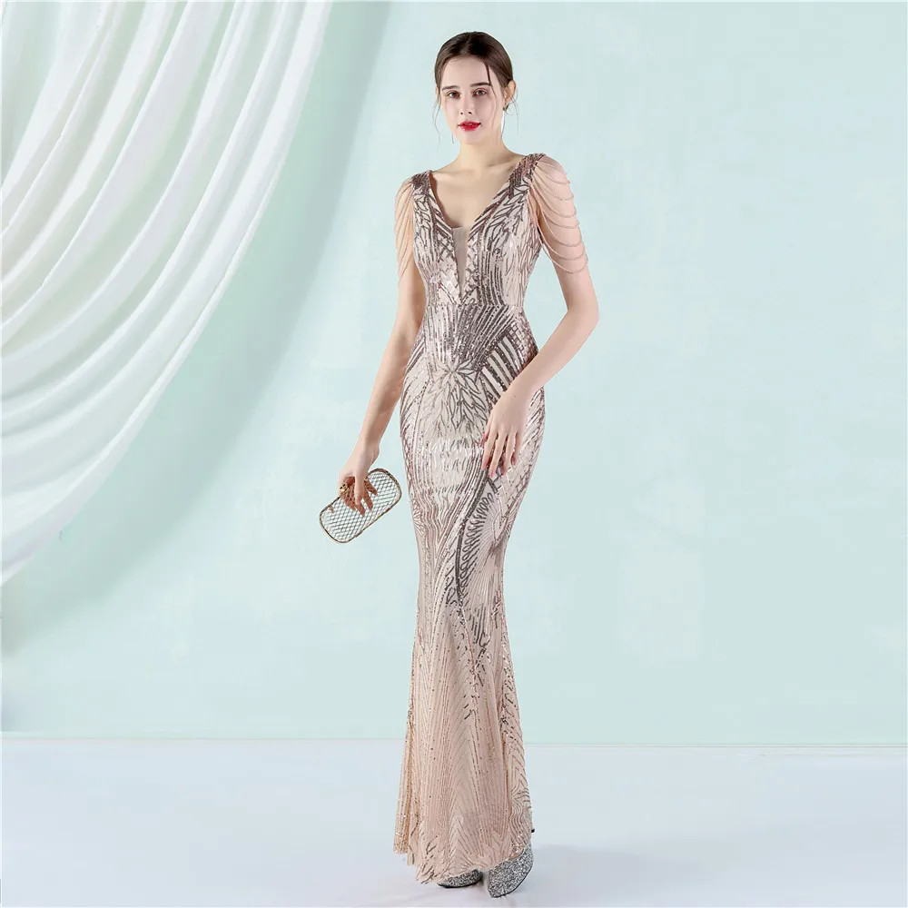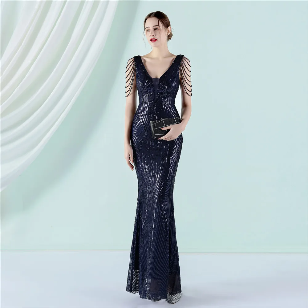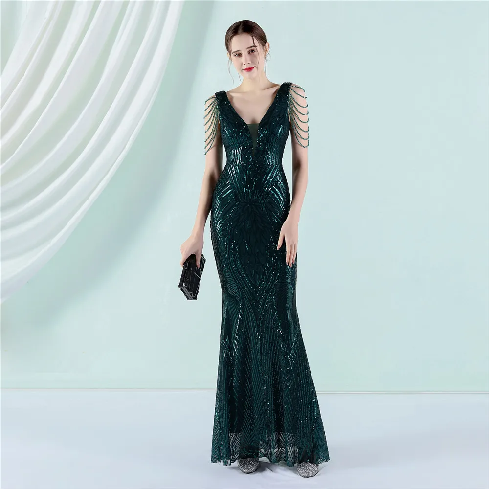 Fleepmart 2022 New Women Elegant V-neck Sleeveless Beading Evening Dress Sexy Mermaid Sequin Women Floor length Party Dress Vestidos