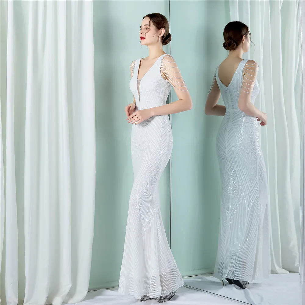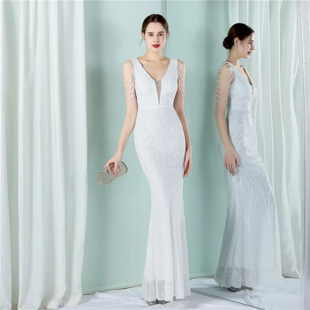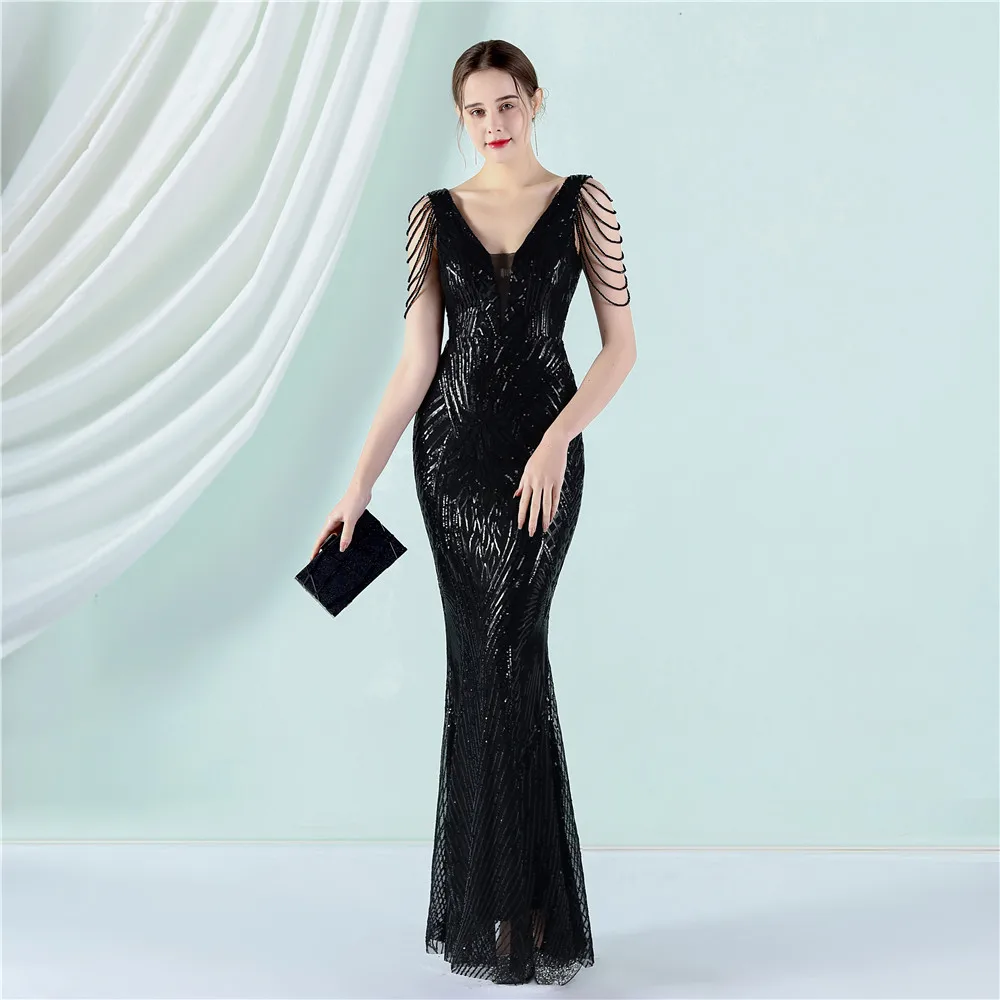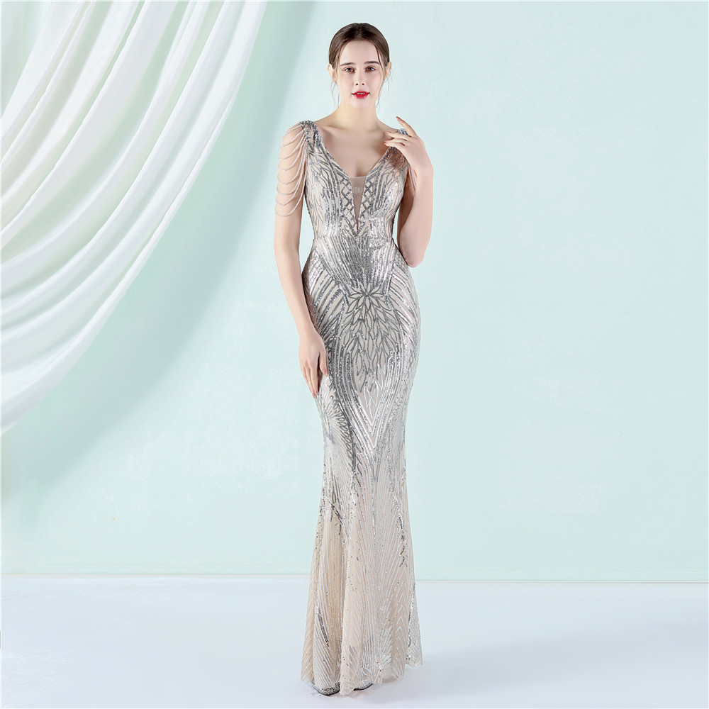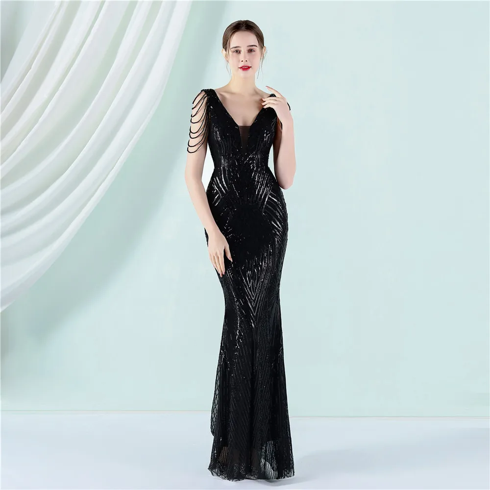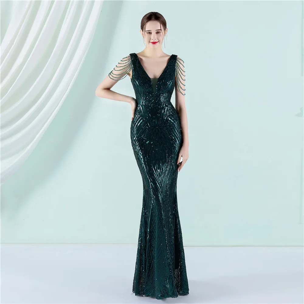 Fleepmart 2022 New Women Elegant V-neck Sleeveless Beading Evening Dress Sexy Mermaid Sequin Women Floor length Party Dress Vestidos