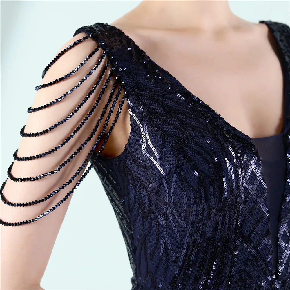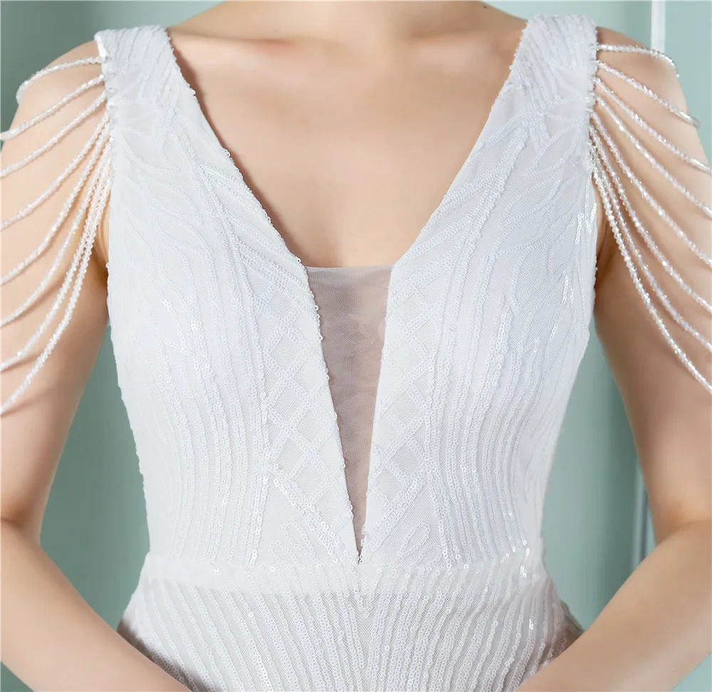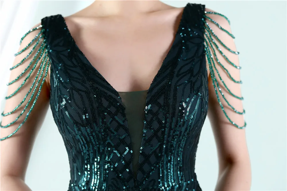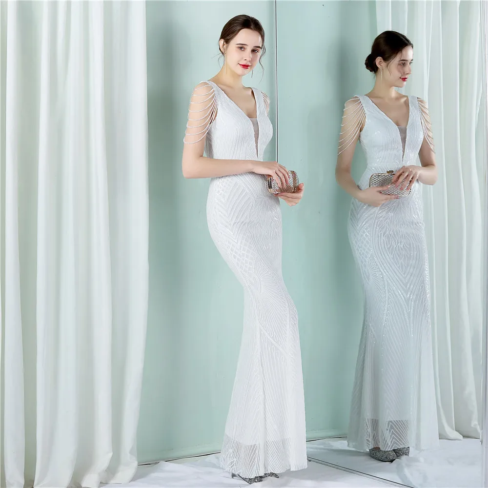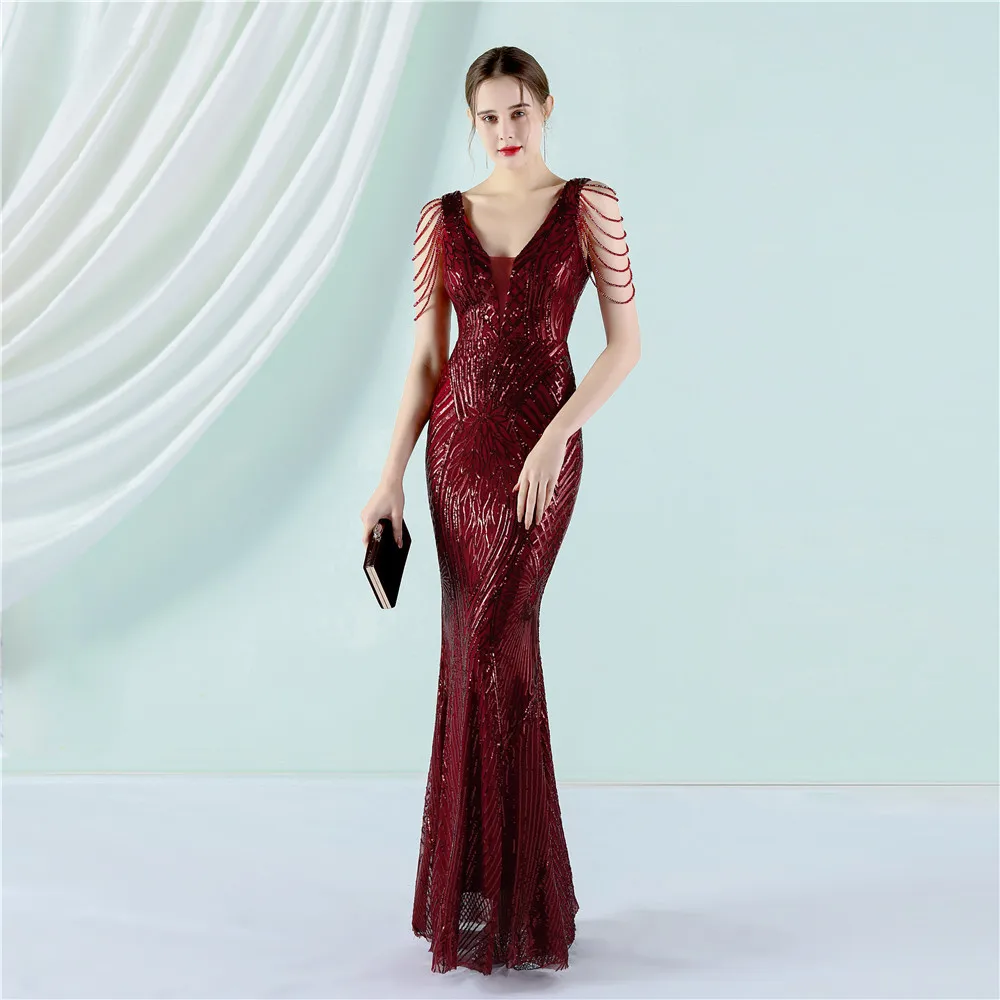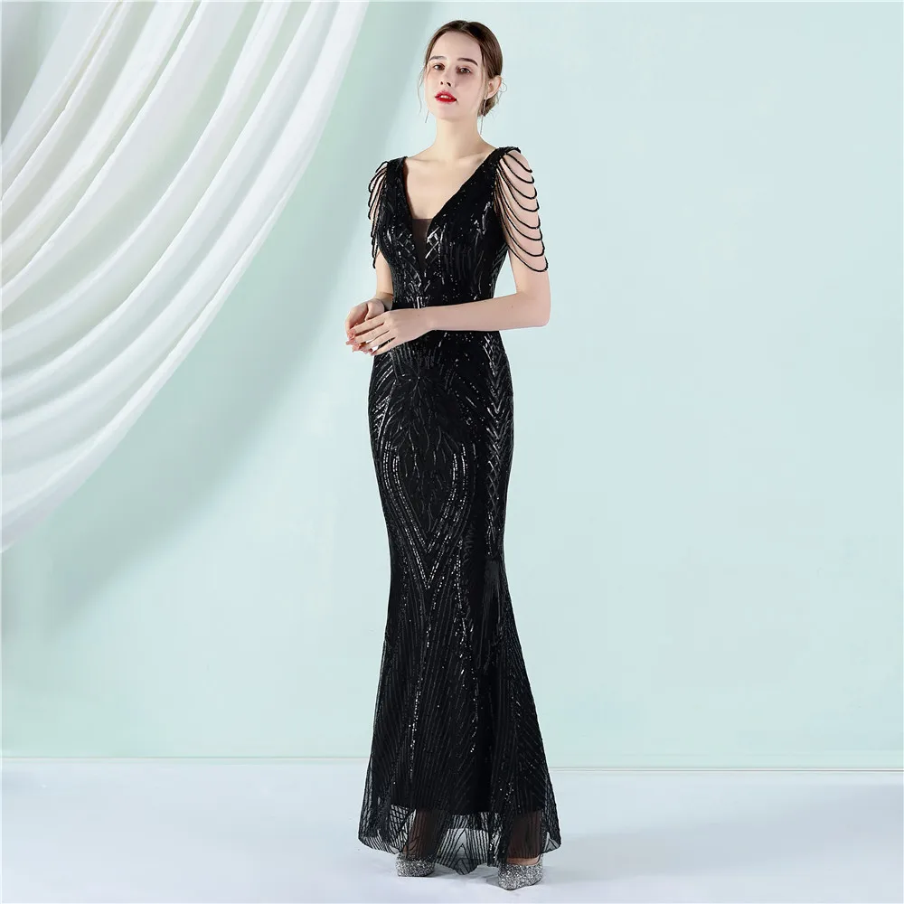 Fleepmart 2022 New Women Elegant V-neck Sleeveless Beading Evening Dress Sexy Mermaid Sequin Women Floor length Party Dress Vestidos