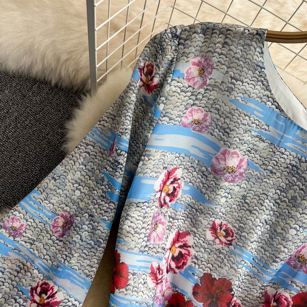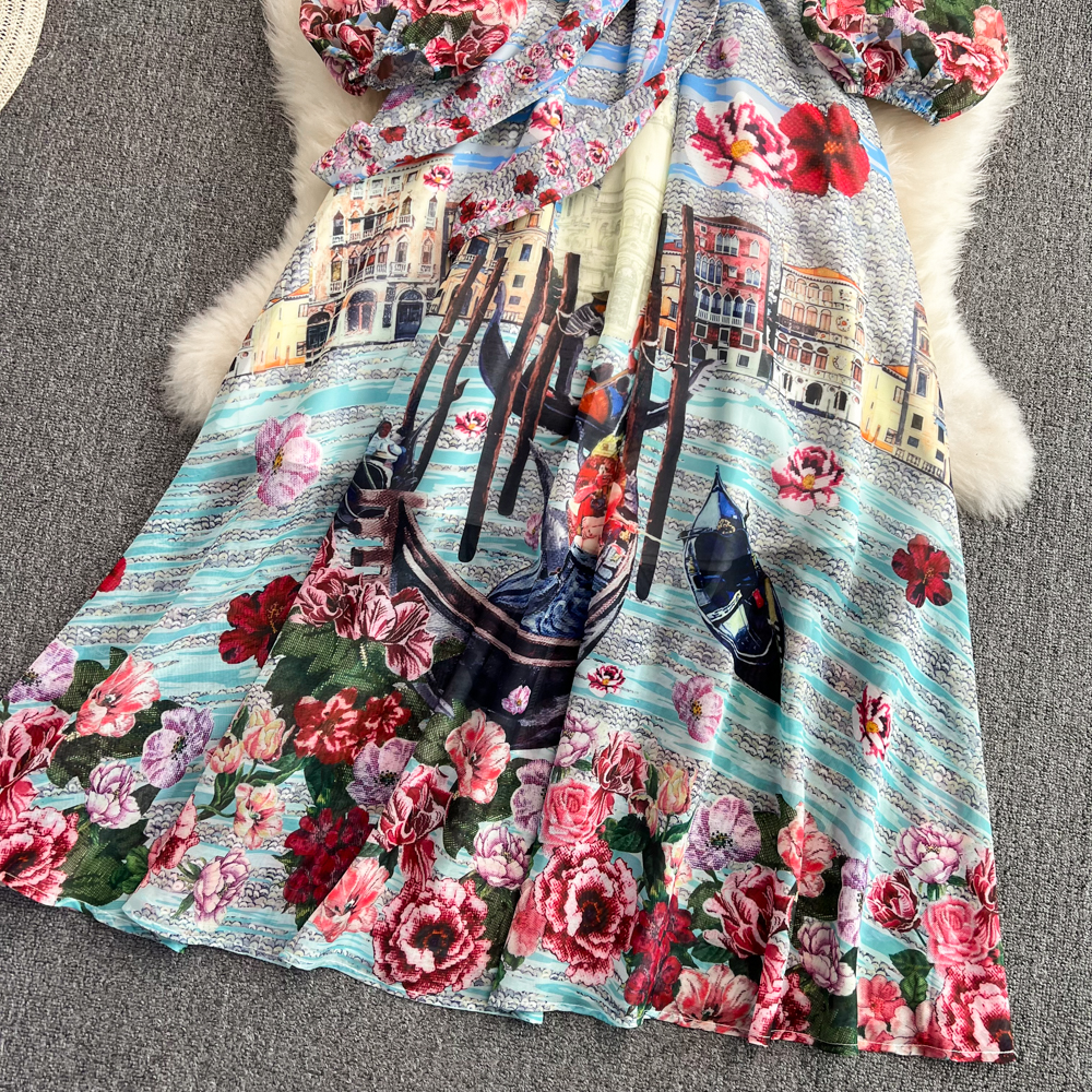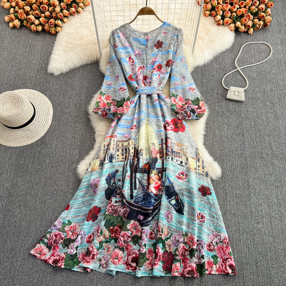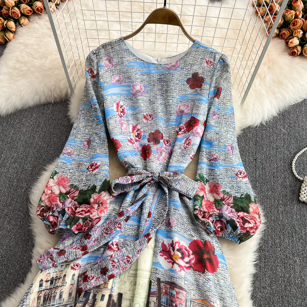 .Fleepmart 2022 Spring Holiday Flower Print Maxi Dress Female’s O Neck Long Sleeve Bow Sashes A-line Party Dresses Women’s Clothing