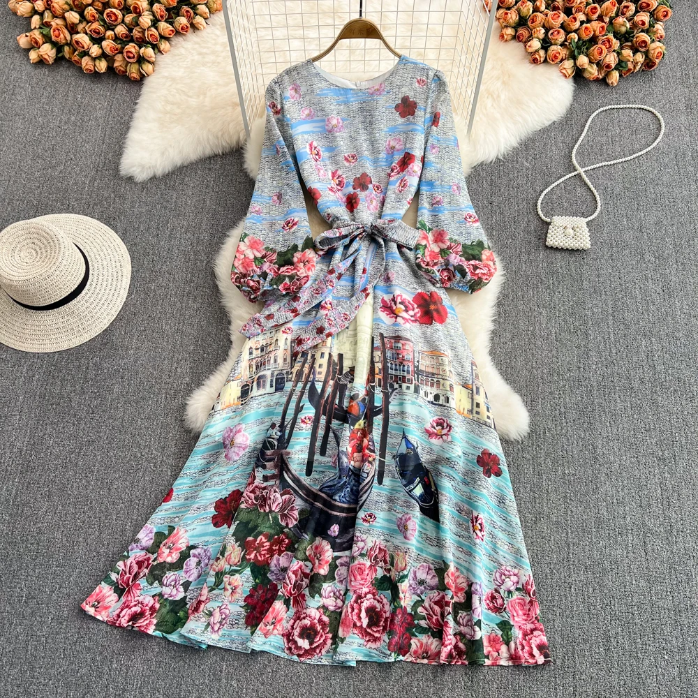 .Fleepmart 2022 Spring Holiday Flower Print Maxi Dress Female’s O Neck Long Sleeve Bow Sashes A-line Party Dresses Women’s Clothing
