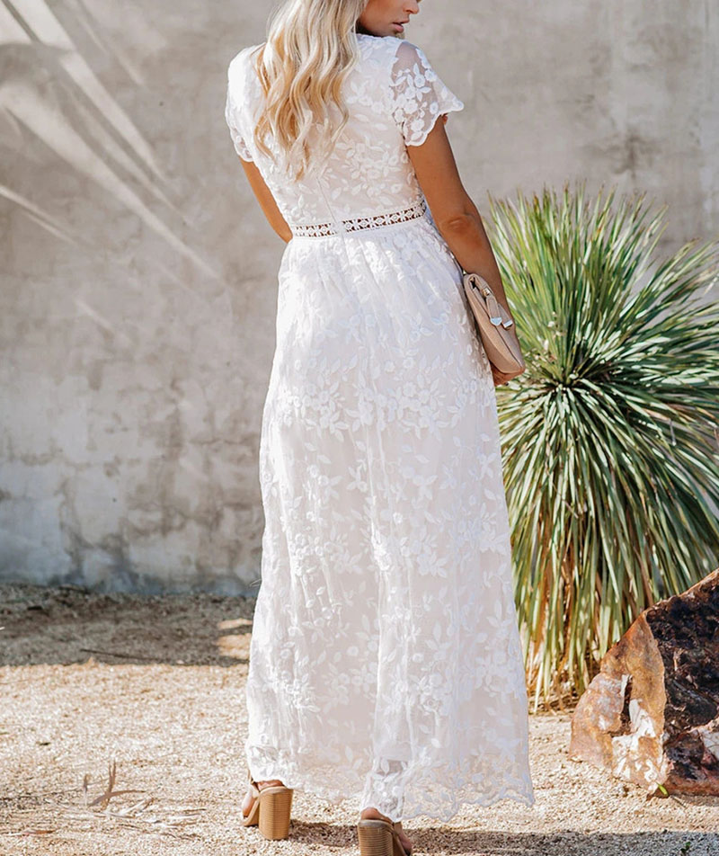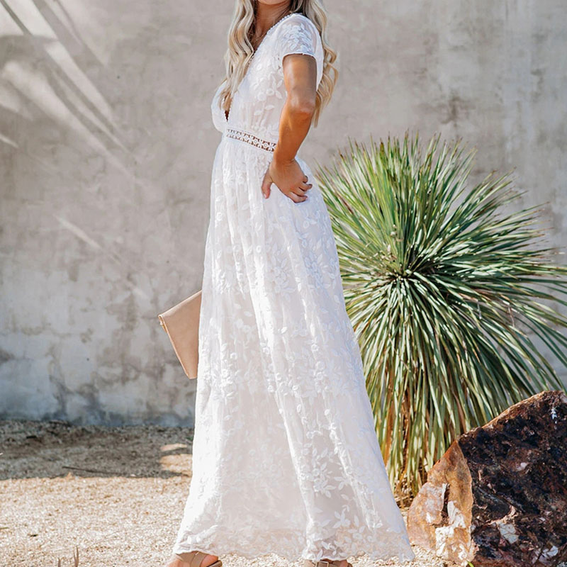 Fleepmart 2022 Summer Boho Women Maxi Dress Embroidery Short Sleeve Vocation Sexy White Lace Tunic Long Beach Dress