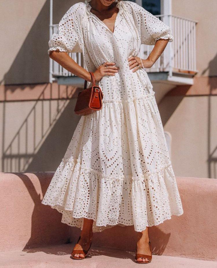 Fleepmart 2022 Summer Boho Women Maxi Dress Vintage Hollow Out White Lace Tunic Beach Dress