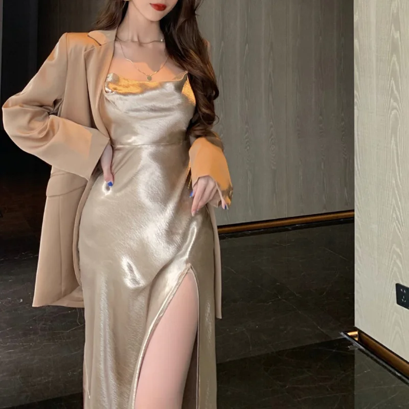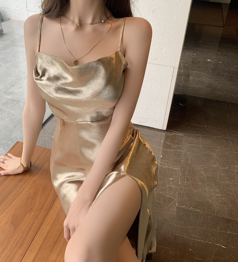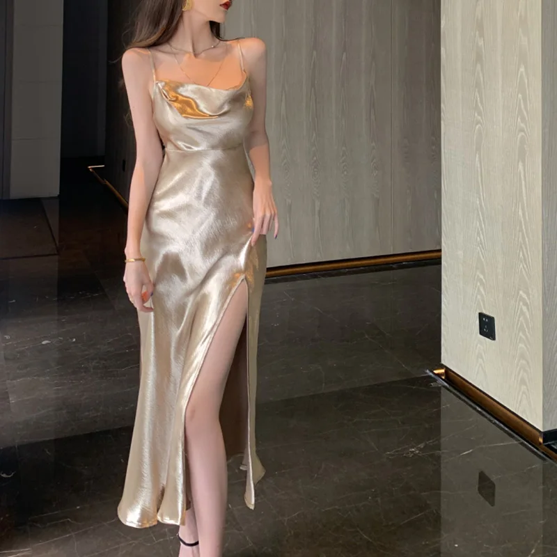 Fleepmart 2022 Summer High Slit Sexy Party Dress Women Satin Slip Dress Spaghetti Strap Champange Silk Shiny Long Dress