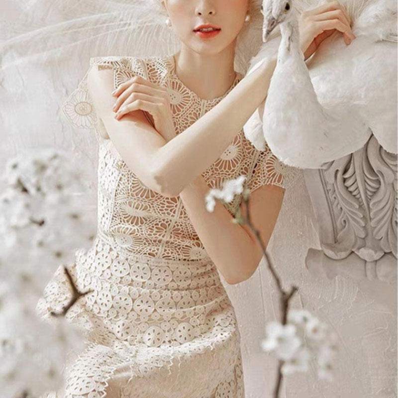 Fleepmart 2022 Summer Luxury Women Lace Party Dress Short Sleeve Vintage Elegant Lady Sexy Midi Dress